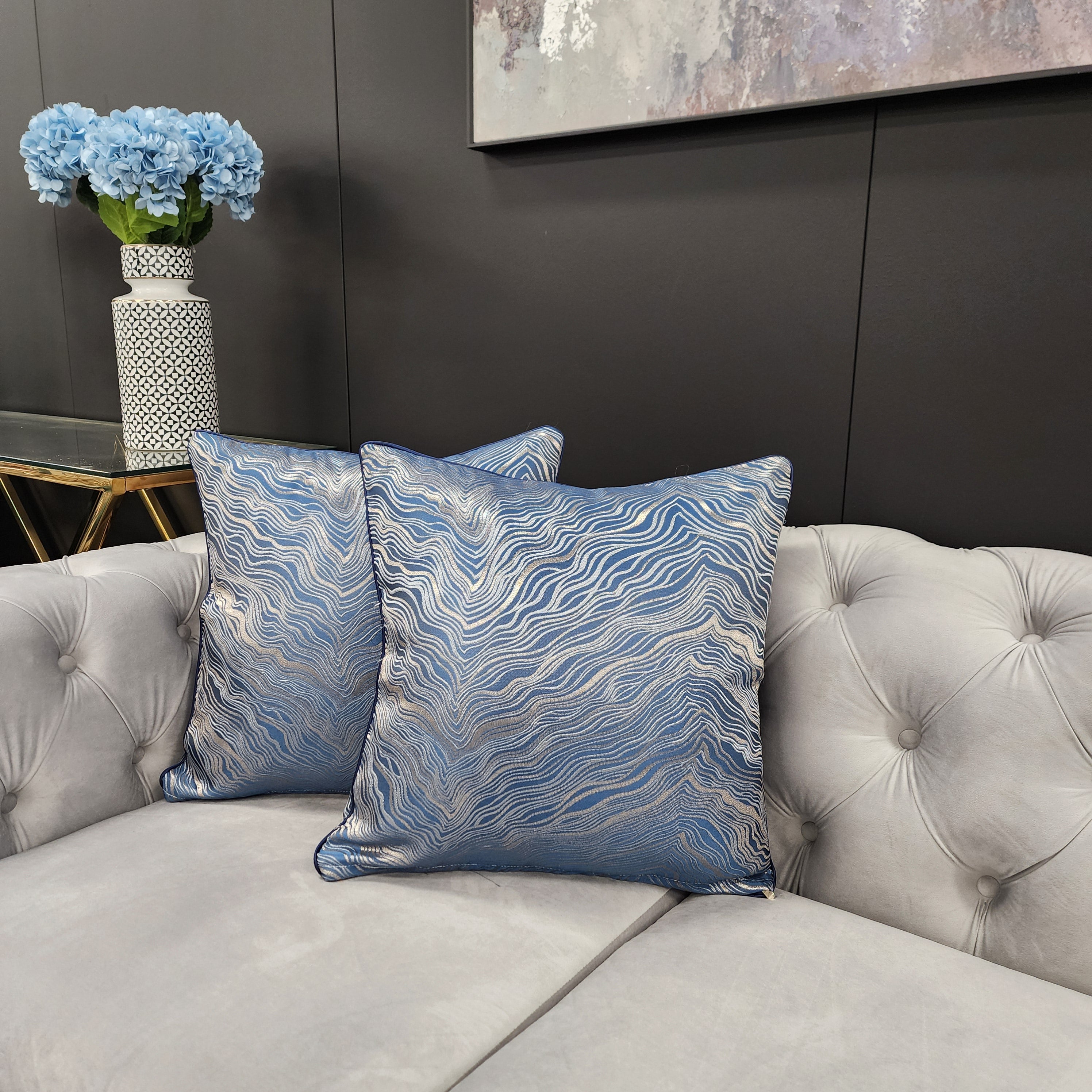 Atlantis Blue Designer Cushions styled on grey sofa, modern wave design with gold highlights