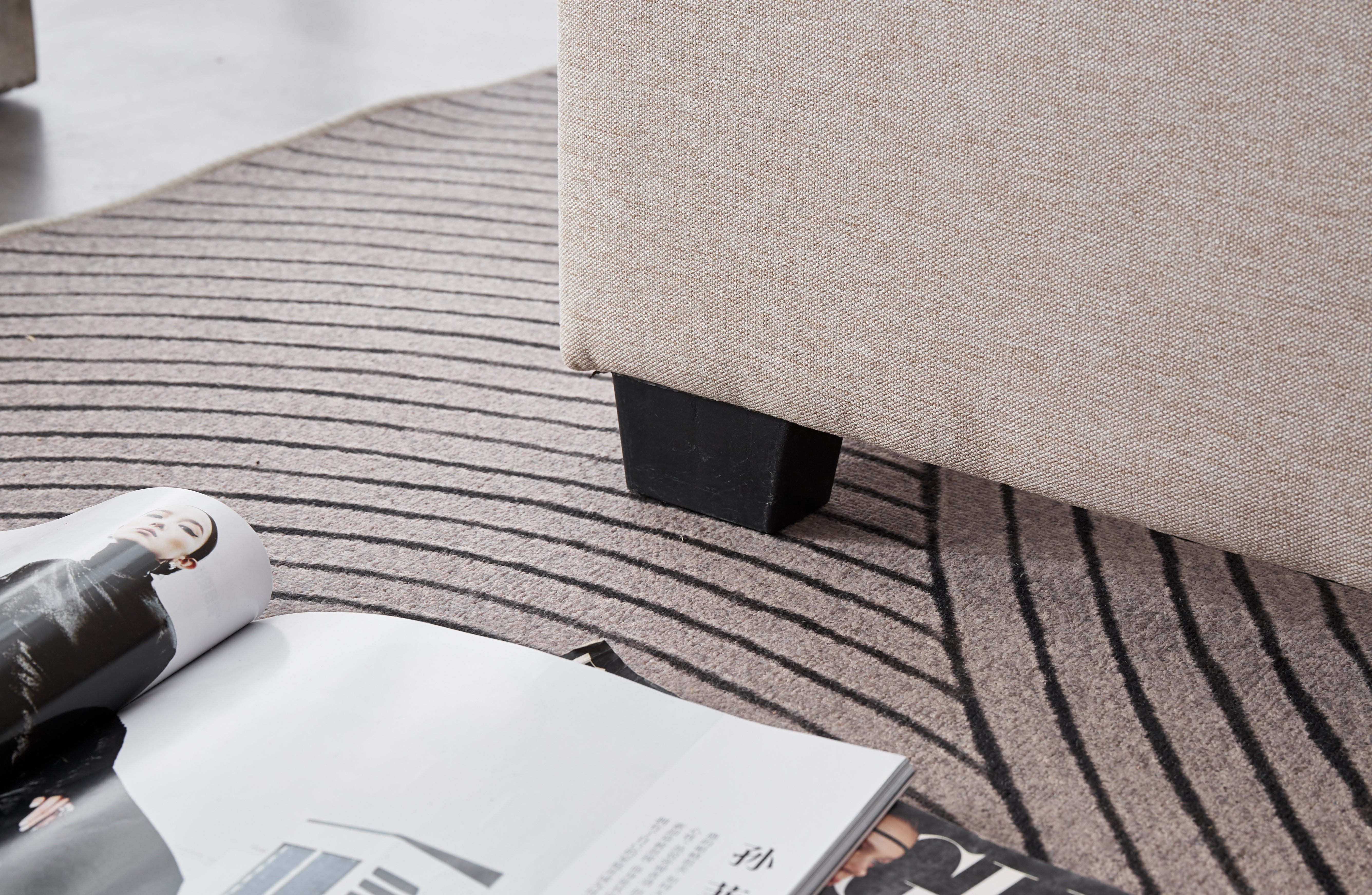 • Detail of Cambridge Bed sturdy black legs with beige linen frame finish.