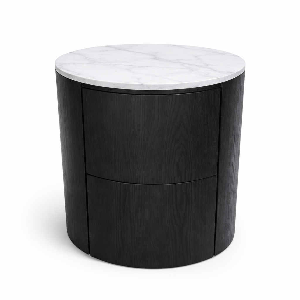 Sleek black round bedside table with marble top and smooth drawers for elegant modern night storage