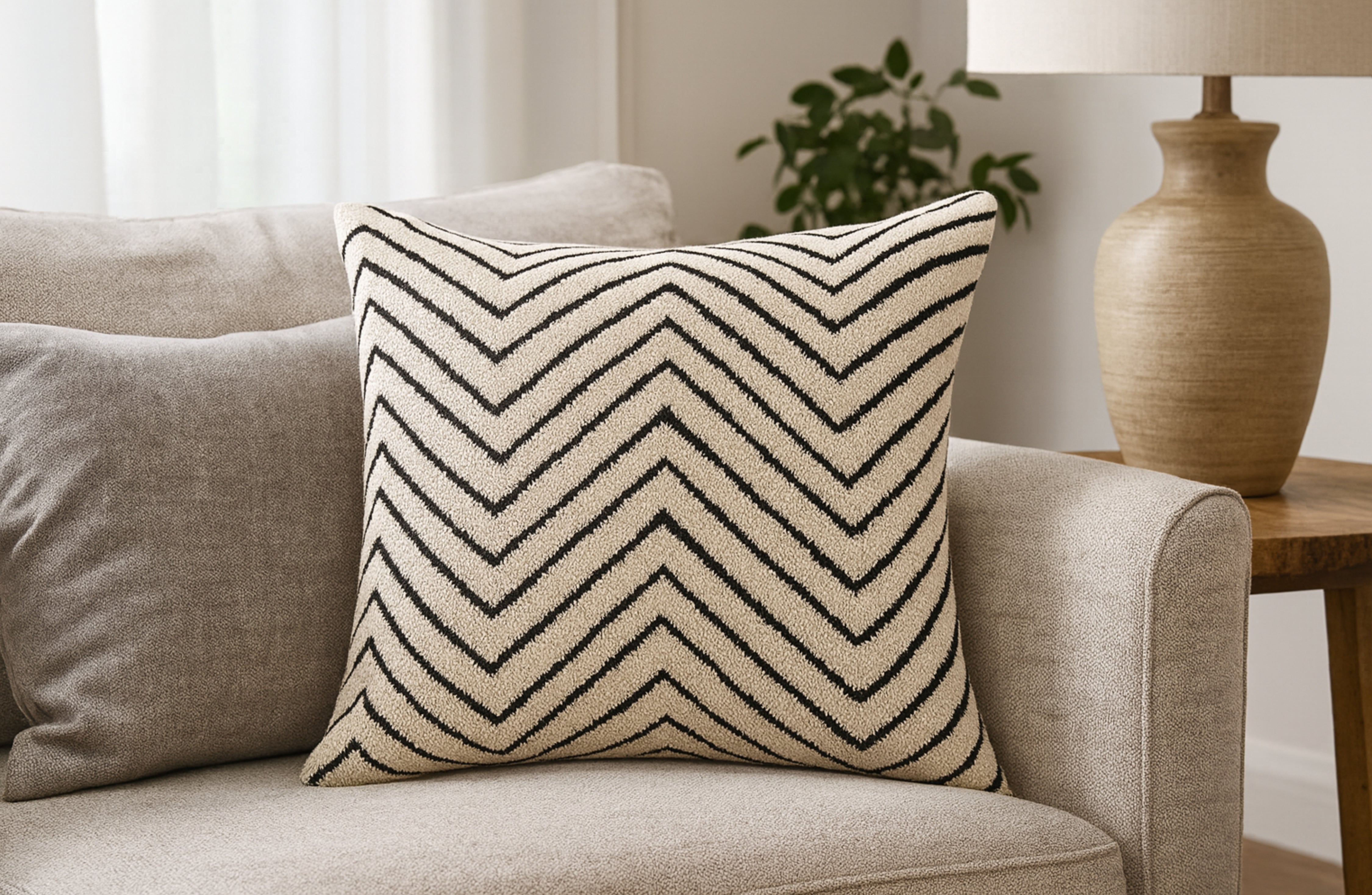 Enhance your interiors with the bold elegance of the Reese Luxury Cushion — a designer pillow featuring a modern chevron pattern available in two classic tones: Grey and Black. Crafted from structured, textured woven fabric, this cushion blends style with durability. The dynamic zigzag design brings energy and sophistication to both minimalist and urban interiors. Whether layered with other cushions or used as a statement piece, it adds movement, texture, and refined contrast to your space.