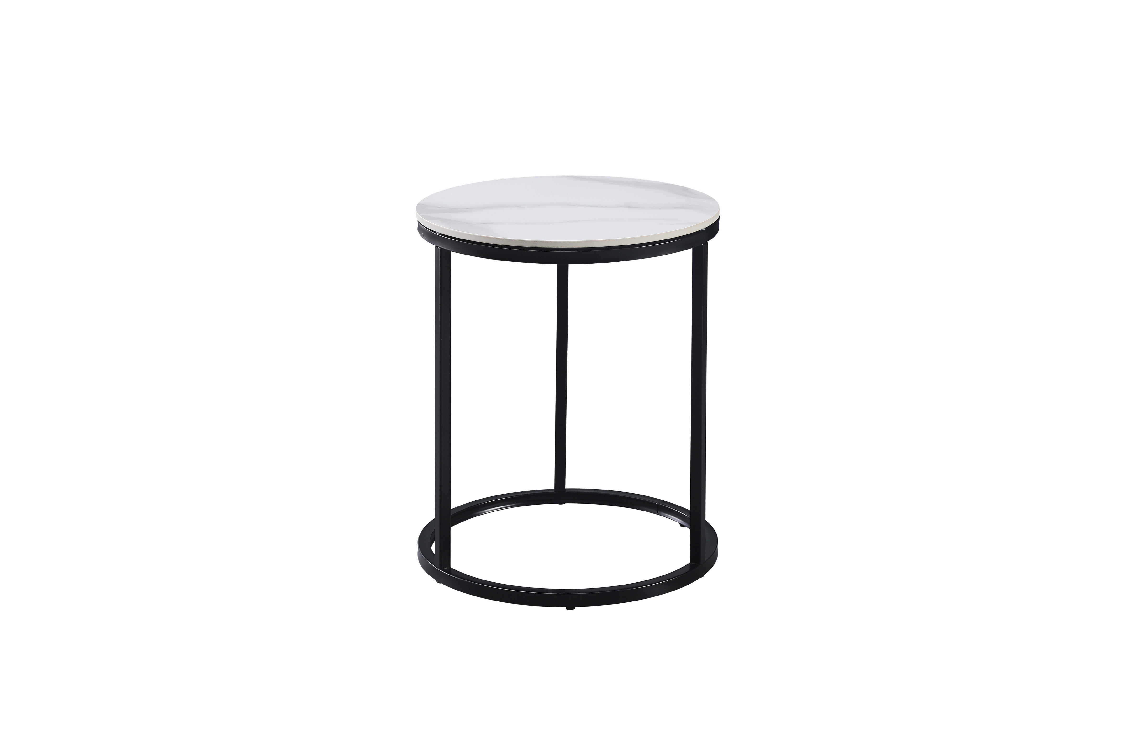 • Romana Side Table styled in a modern living room with black frame and white marble top.