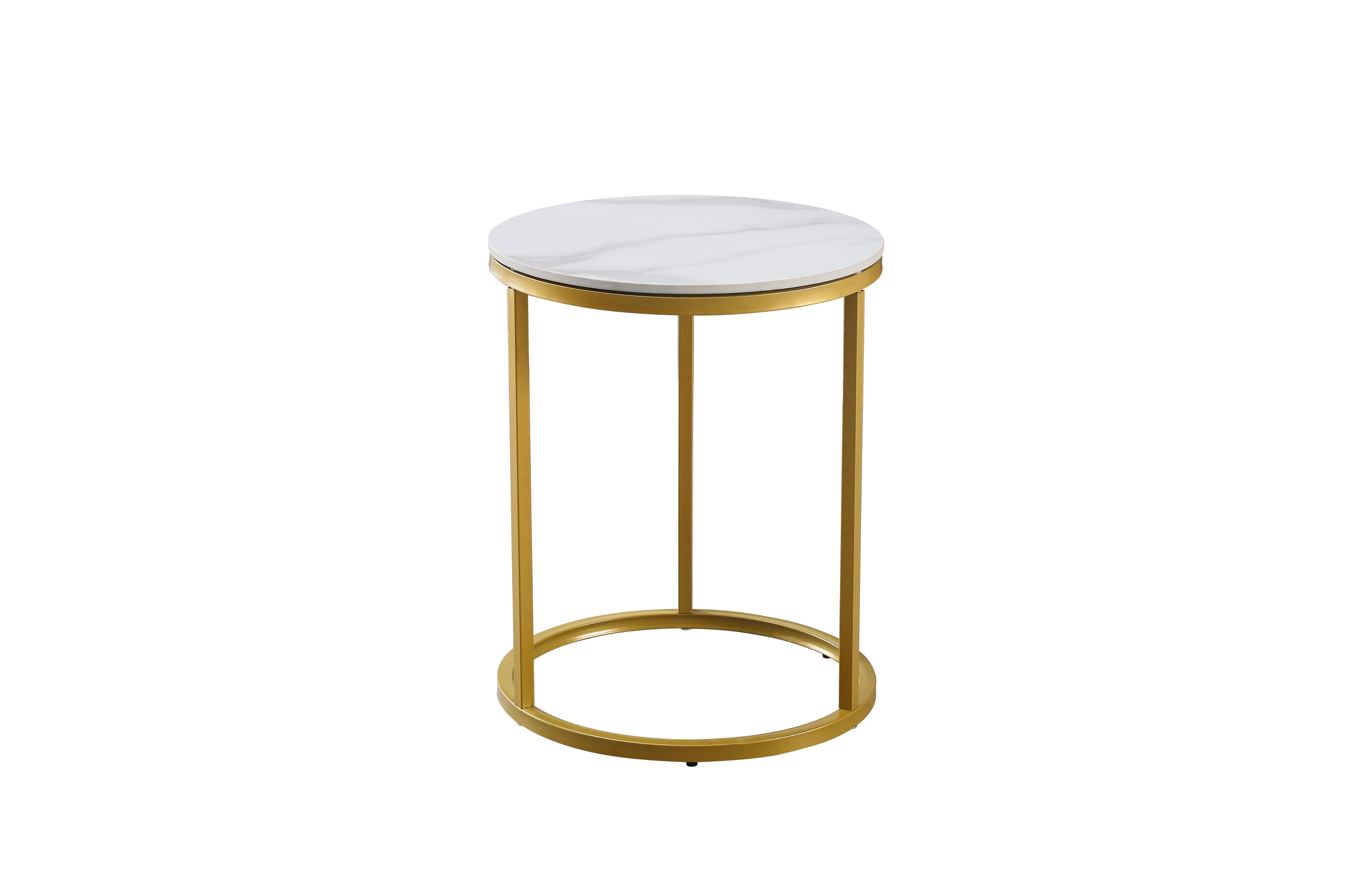 Romana Side Table in a living room setting with champagne frame and white marble top.