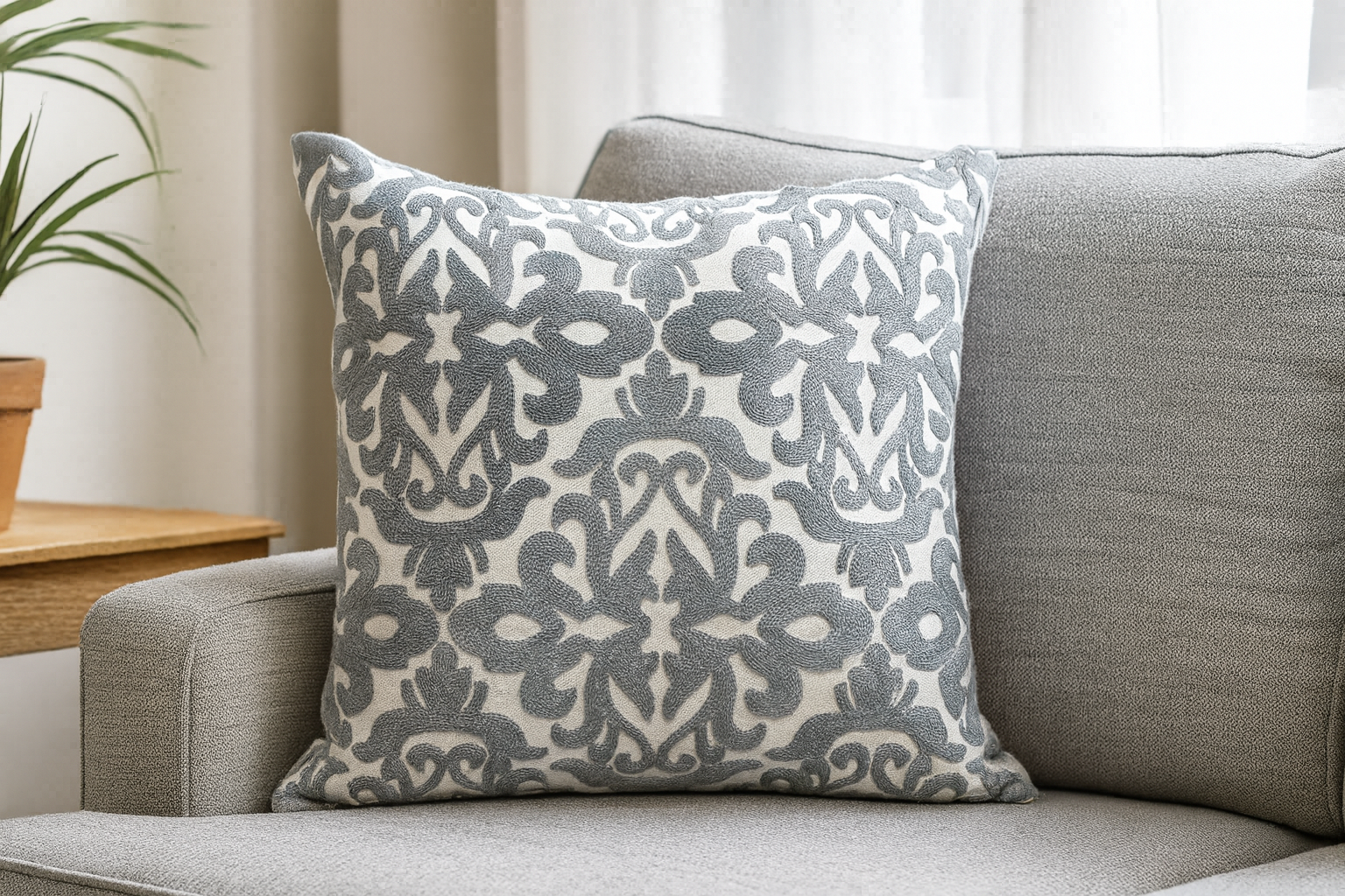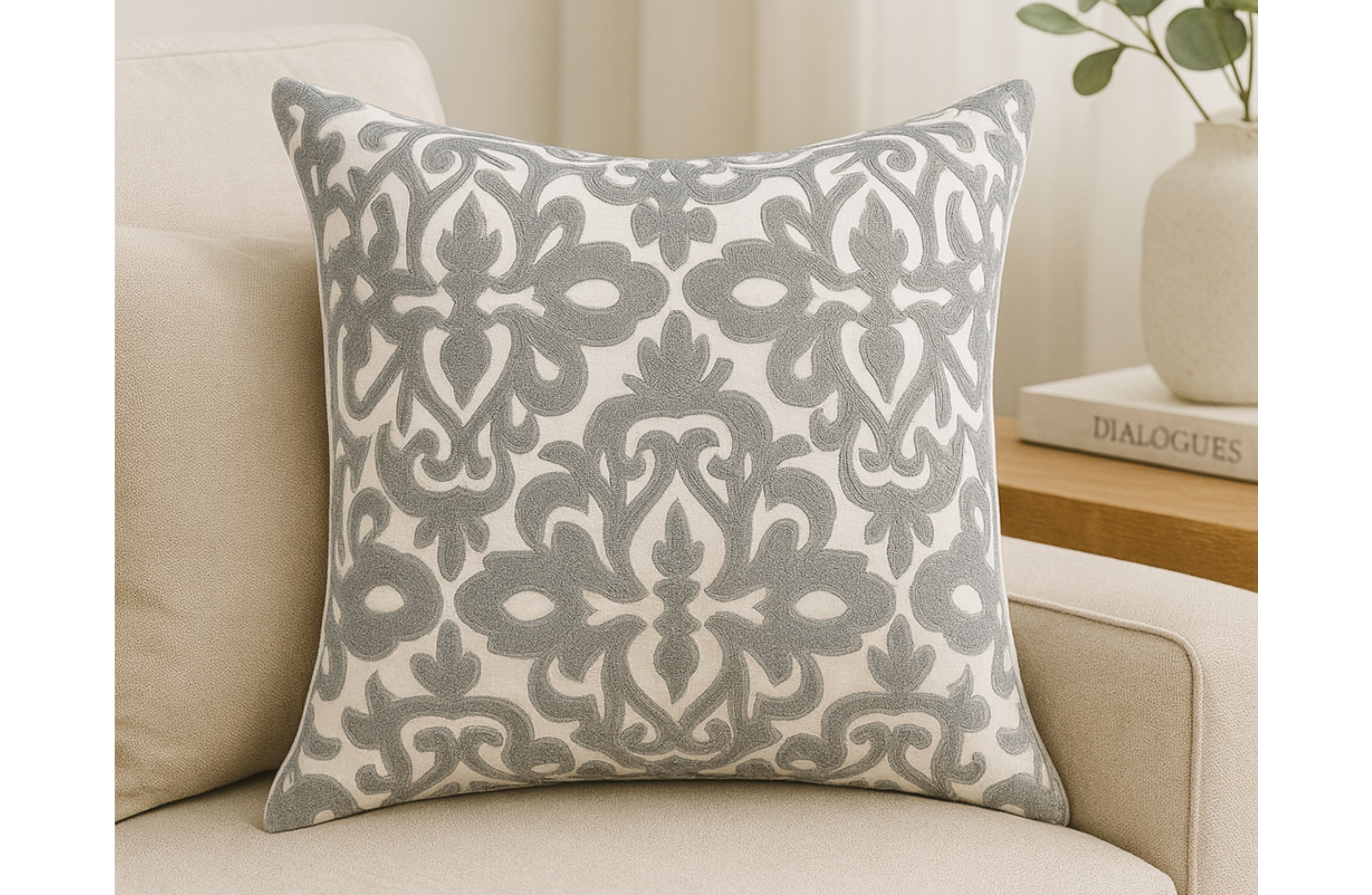 Add a refined elegance to your space with the Shaun Embroidery Luxury Cushion — a designer pillow showcasing a grey and white damask-style pattern. Made from a smooth, cotton or cotton-blend fabric, this cushion blends comfort with a classic decorative flair. The symmetrical, ornate design brings timeless charm to modern classic, neutral, or transitional interiors, making it a graceful addition to bedrooms, living rooms, or lounge setups.