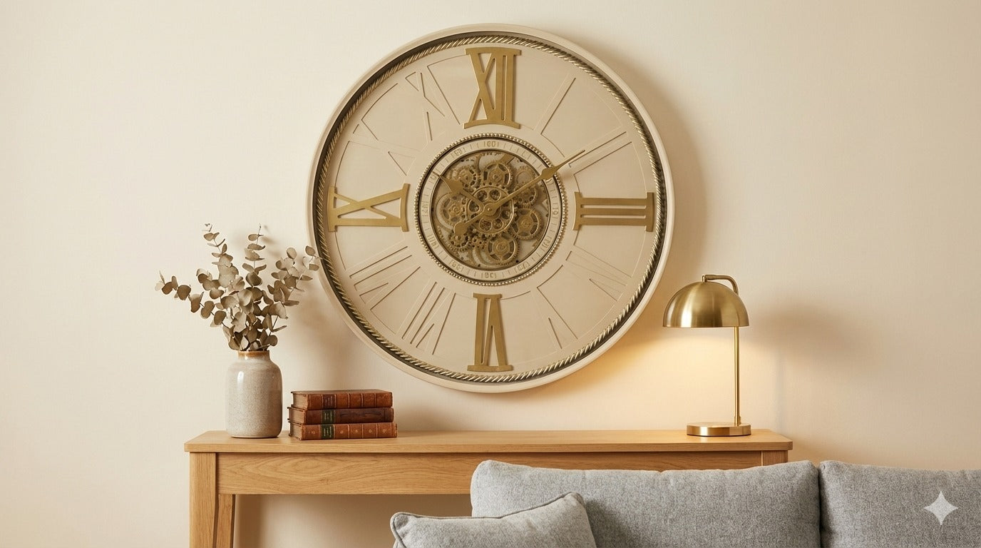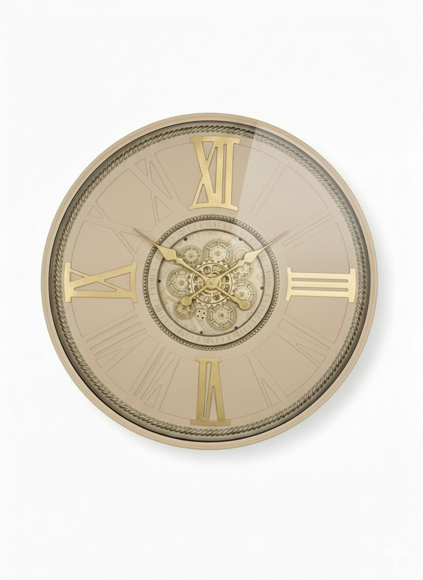 The Tammy Mechanical Wall Clock by Elegant Collections is a refined timepiece designed to impress with both size and style. Featuring a natural and gold multi-colour palette, this oversized wall clock brings together traditional Roman numerals, elegant clock hands, and exposed moving gears for a visually captivating display.