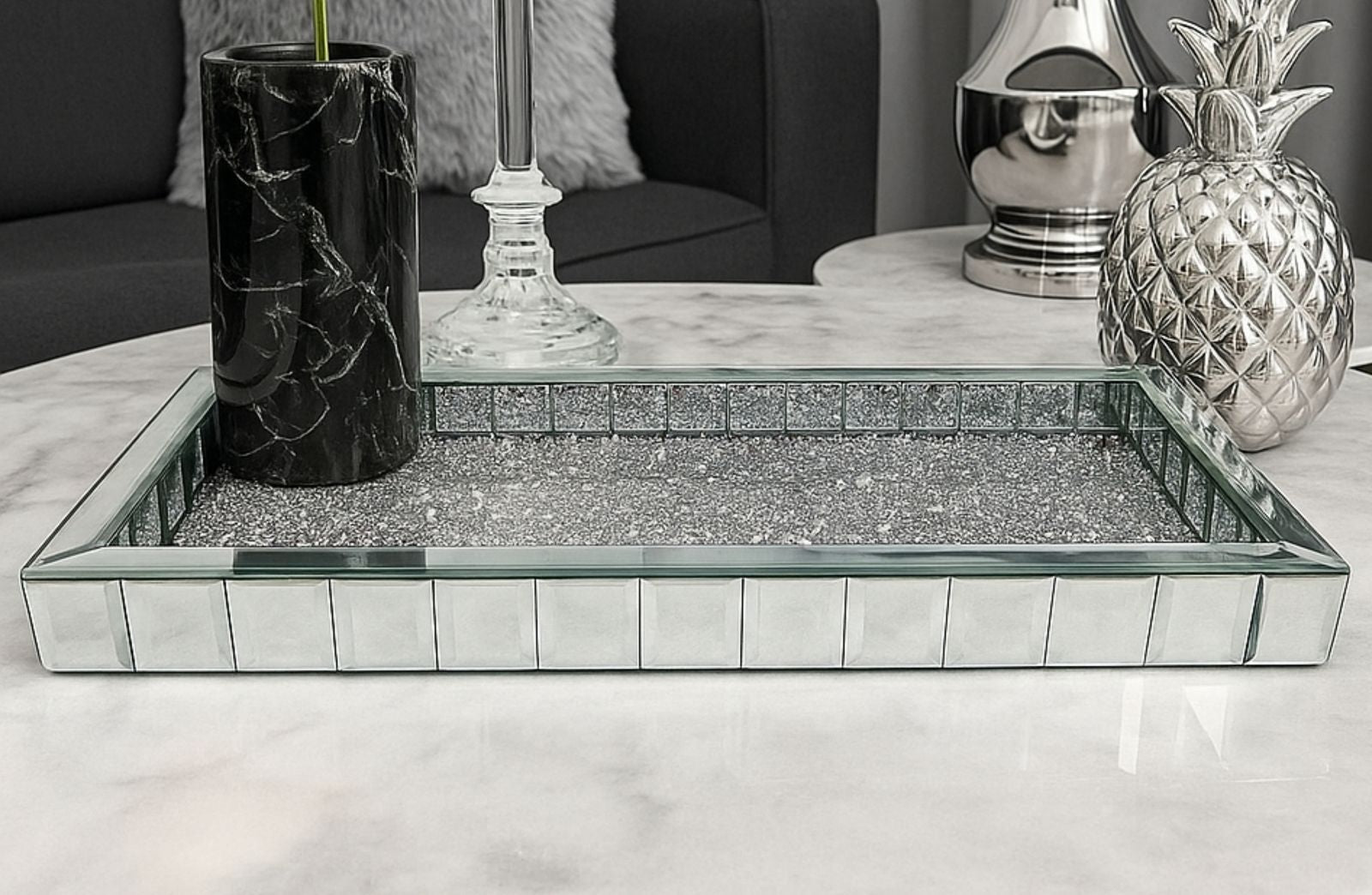 Introducing the Vogue Diamond Tray, a luxurious and sophisticated home décor item that will elevate the ambiance of any room. This exquisite tray is a true statement piece, designed with a bevelled mirror and adorned with diamonds, adding a touch of elegance and glamour to your living space.