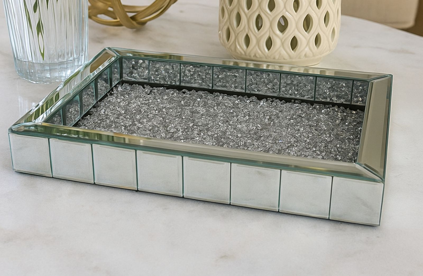 Crafted with high-quality materials. The bevelled mirror adds a stunning reflective quality to the tray, making it a perfect addition to any vanity or dresser. The diamonds add a touch of luxury and glamour, making it an ideal choice for those who want to add a touch of sophistication to their home décor.