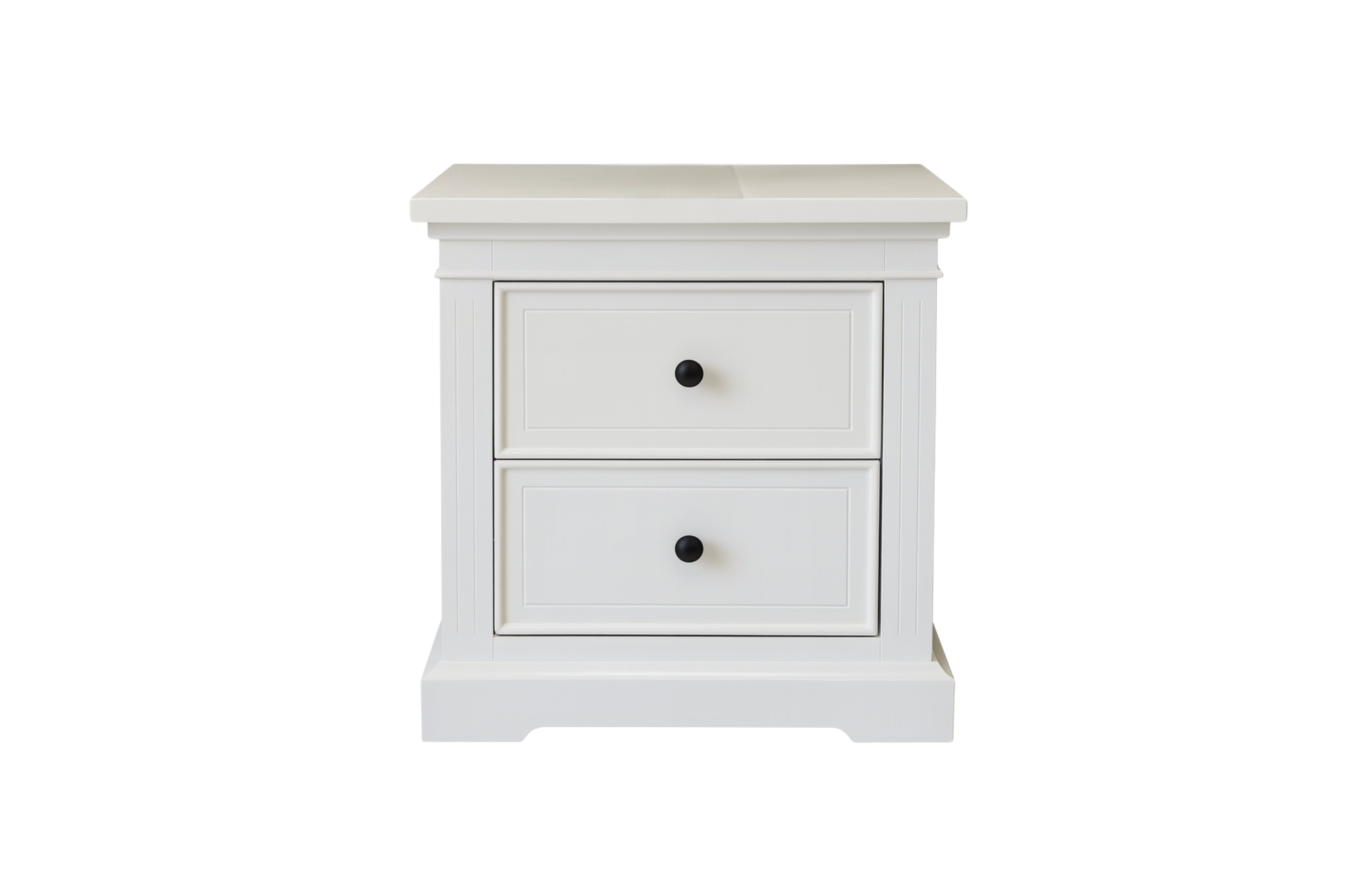 Hamptons white bedside table with two drawers and classic panel detailing in coastal style.