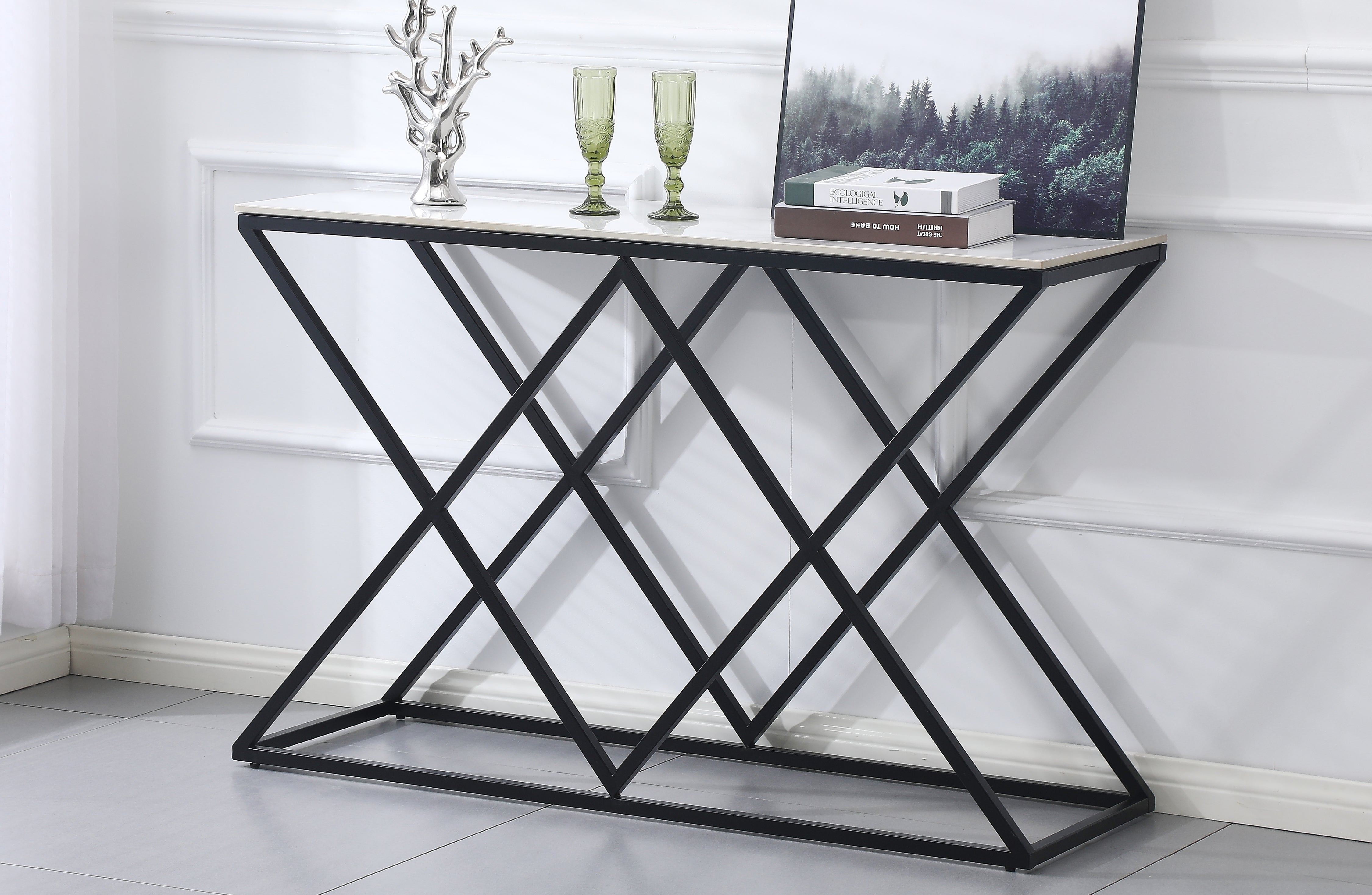 • Beverly console table with black frame and white marble top styled with décor accessories.