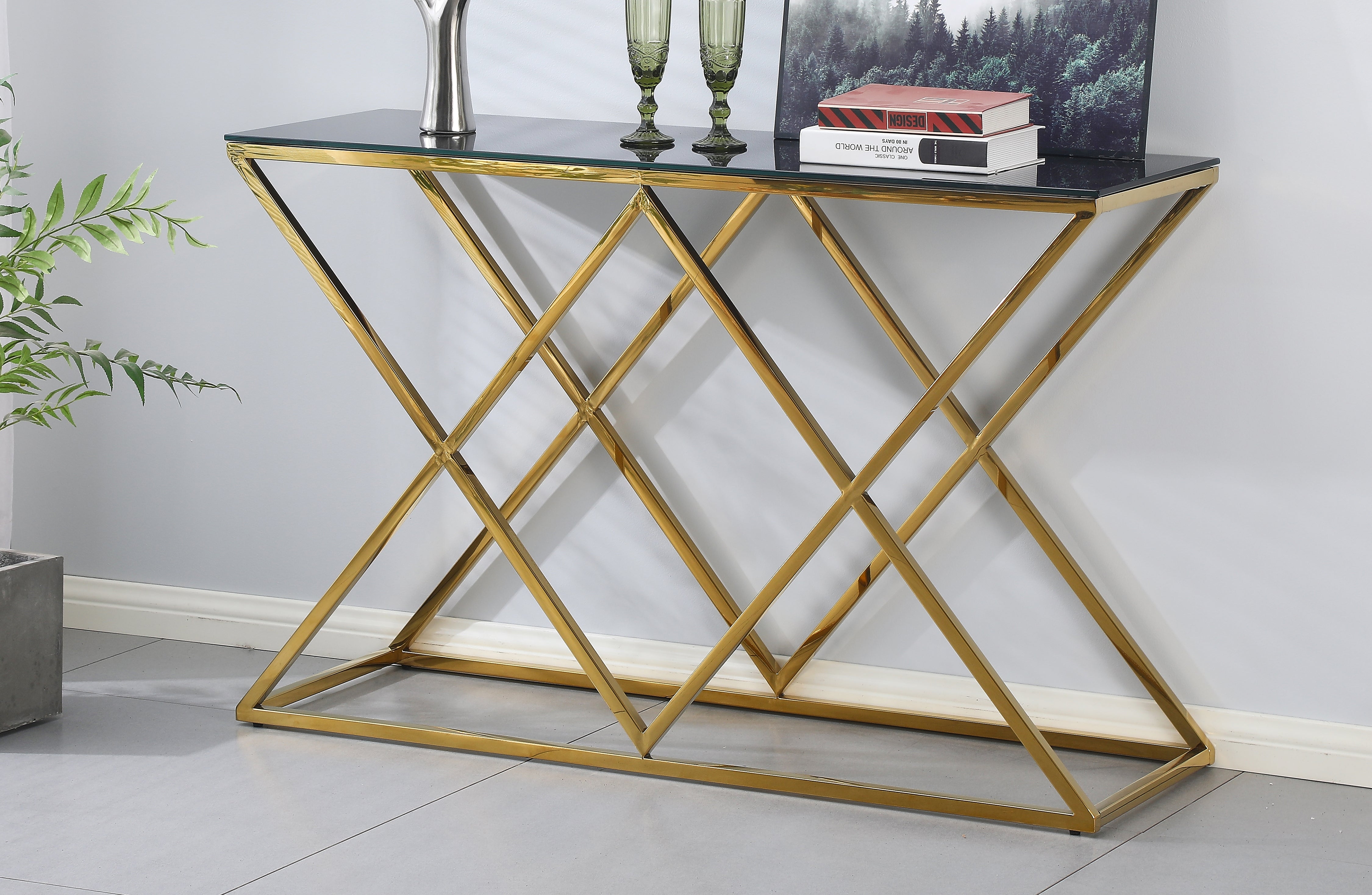 • Beverly console table with gold frame and black glass top styled in a modern living room.