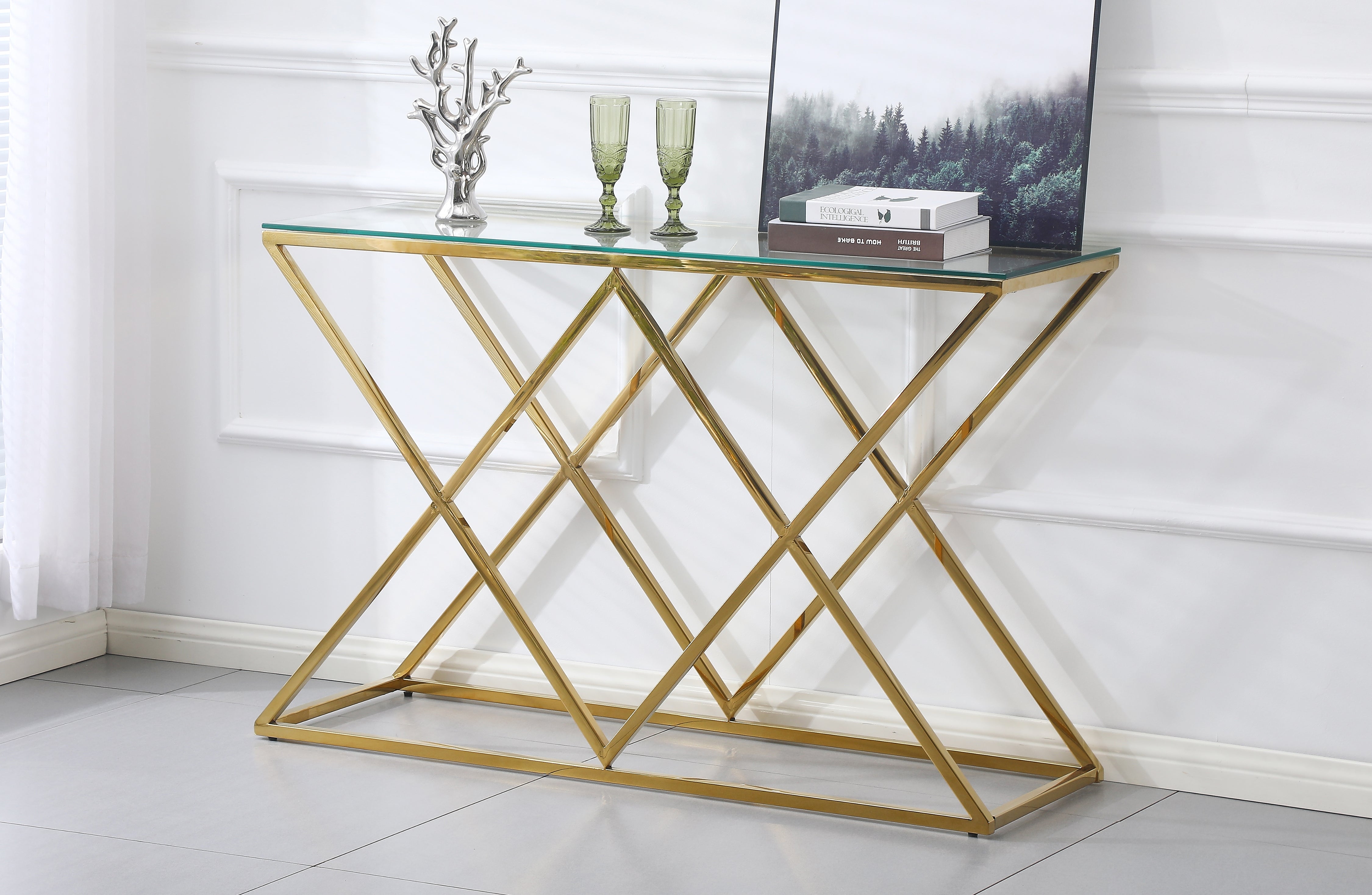 • Beverly console table with gold frame and clear glass top styled with décor.