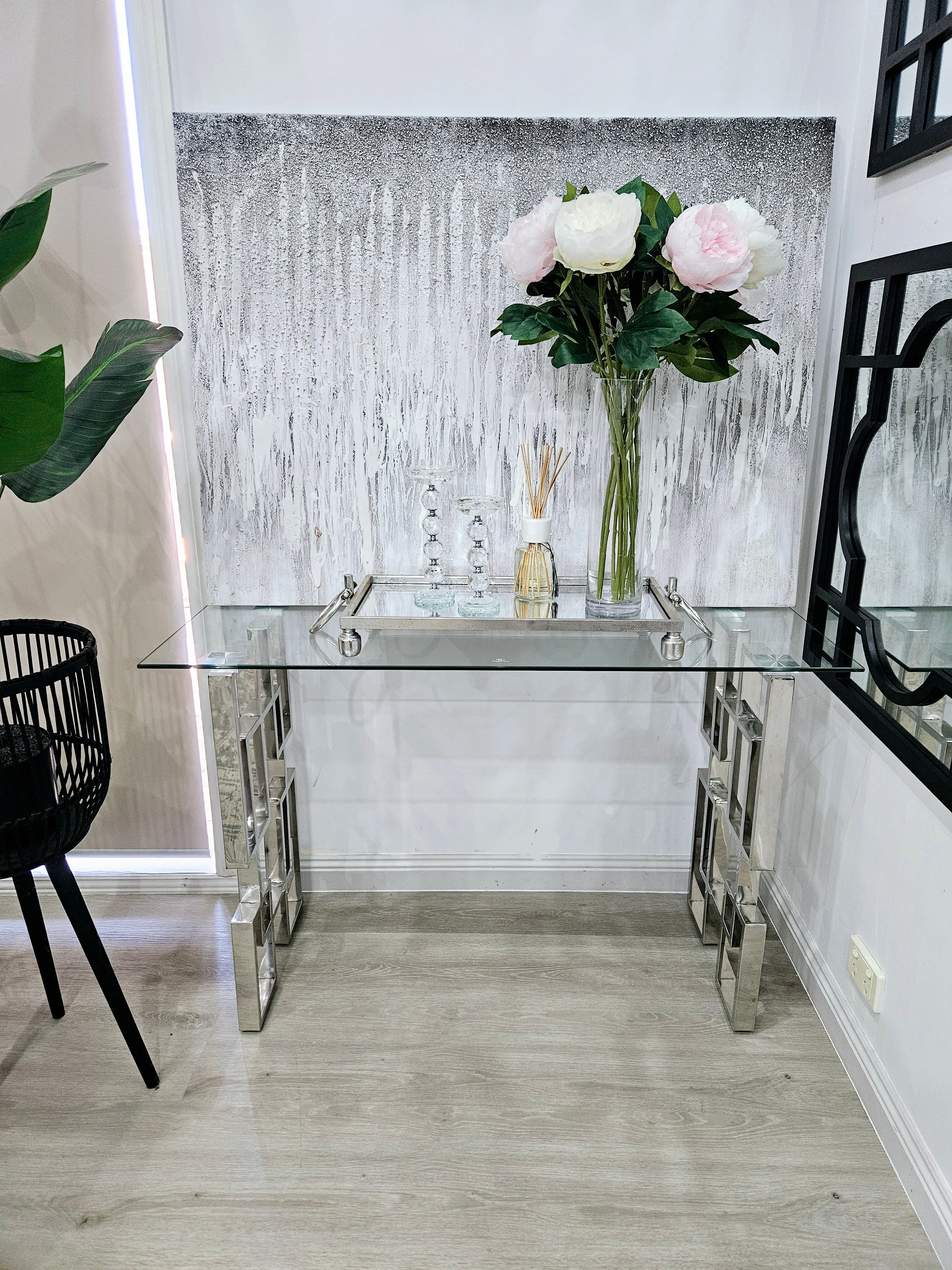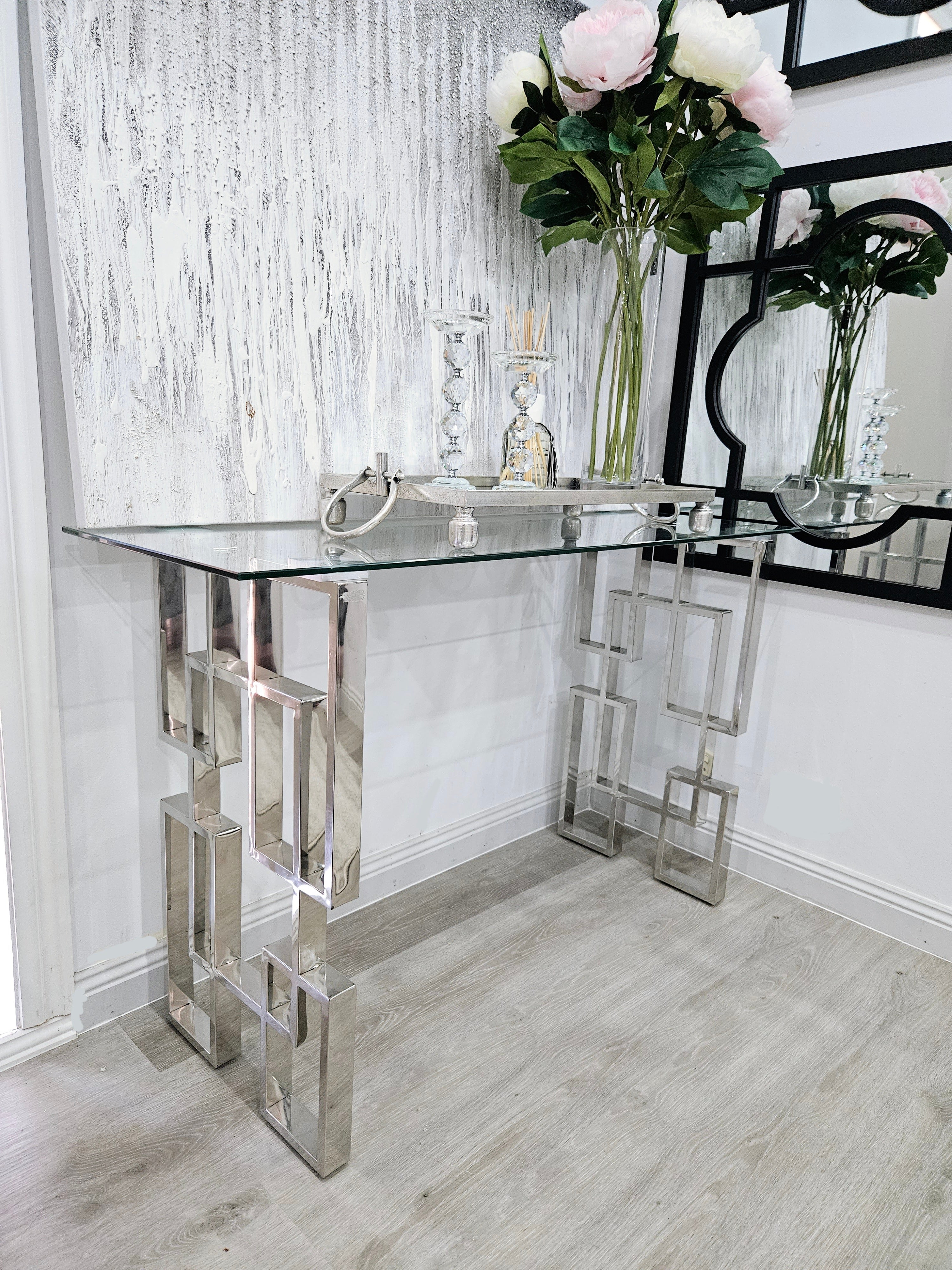 Royale console table with silver frame and glass top styled in a modern entryway setting.