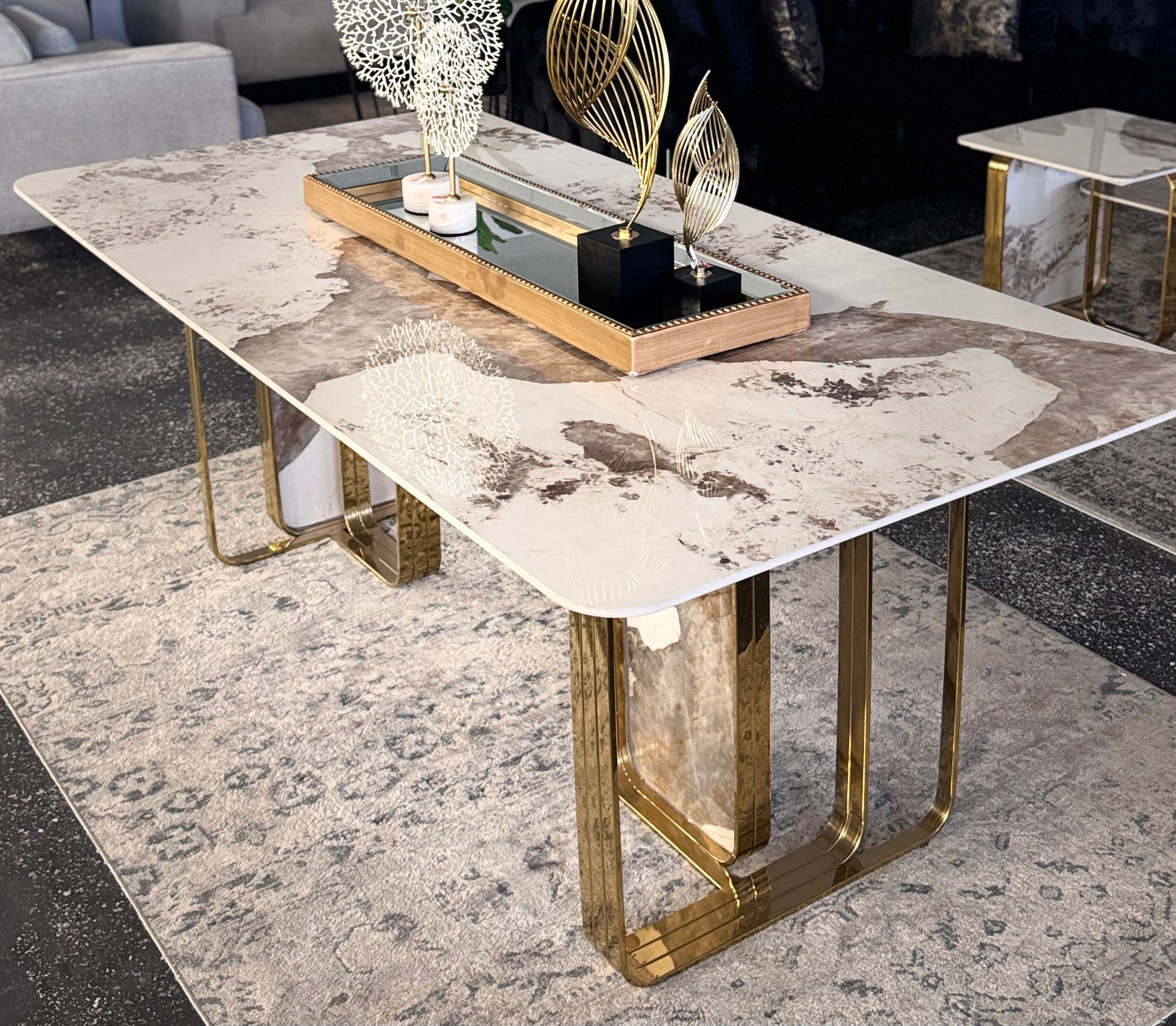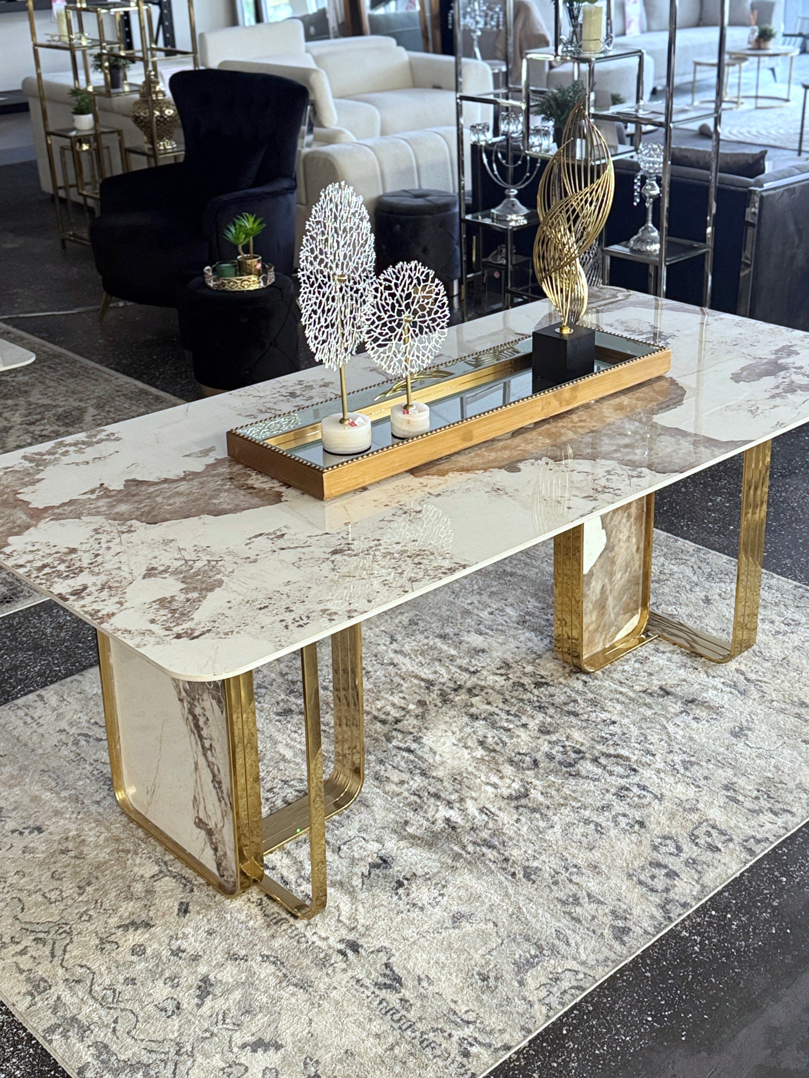 The table features the signature Harper base – a distinctive U-shaped metal frame paired with a marble-inlaid panel. This eye-catching foundation brings architectural interest and modern elegance to your dining space.