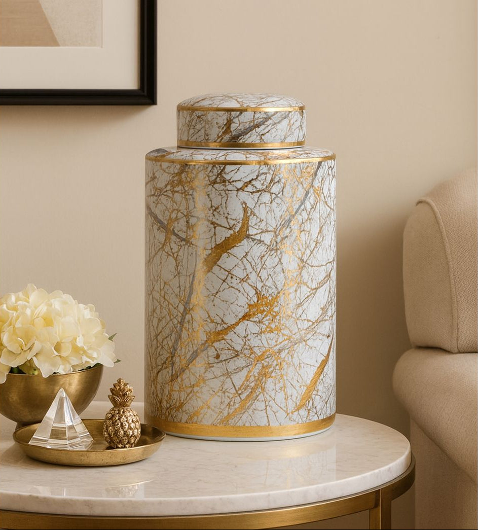 • Elegant ceramic ginger jars in gold and white marble pattern, available in two sizes, perfect for decorative or storage use.
