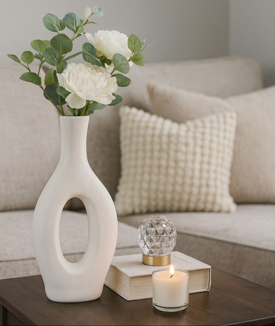 The Noosa Marble Vase showcases a sculptural oval cut-out design in a smooth, marble-look finish. With its minimalist silhouette and refined natural off-white tone, it brings understated luxury to any interior. Use the small and large sizes separately or pair them together for a stylish layered display. Whether styled with faux florals or left empty, these vases are perfect for modern, coastal, or Scandinavian settings.