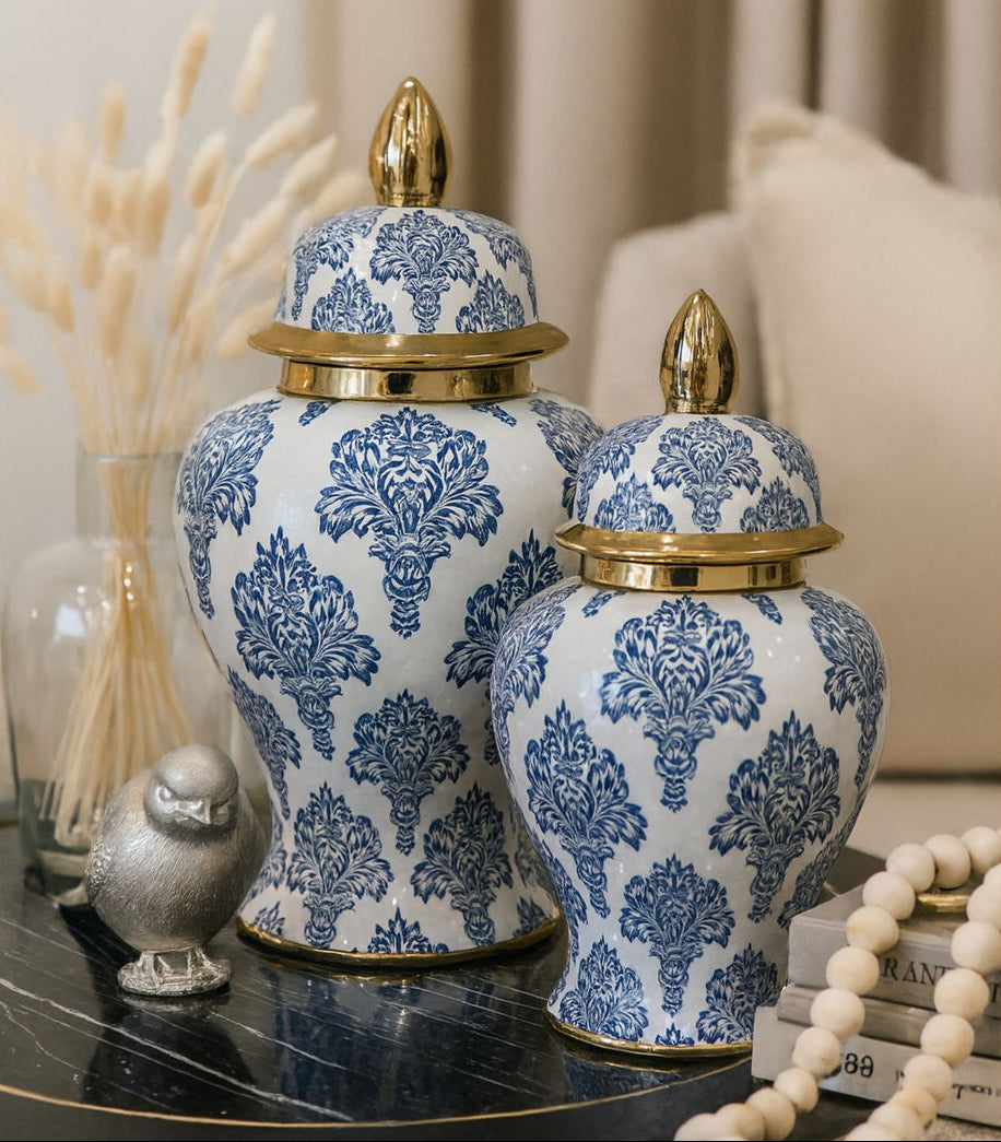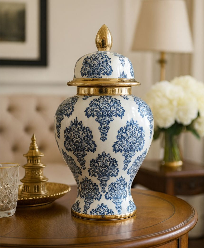 Material: The Damask Ceramic Urn is made from high-quality ceramic, ensuring durability and a beautiful finish. It is glazed with a shiny finish, making it a perfect addition to any luxurious style décor.