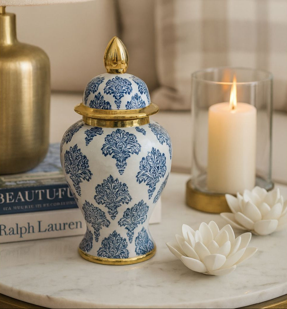 The Damask Ceramic Urn features a damask-style pattern with intricate detailing and gold accents, creating a luxurious and classic look. The blue colour blend enhances the visual interest and adds a touch of calmness to any surrounding.
