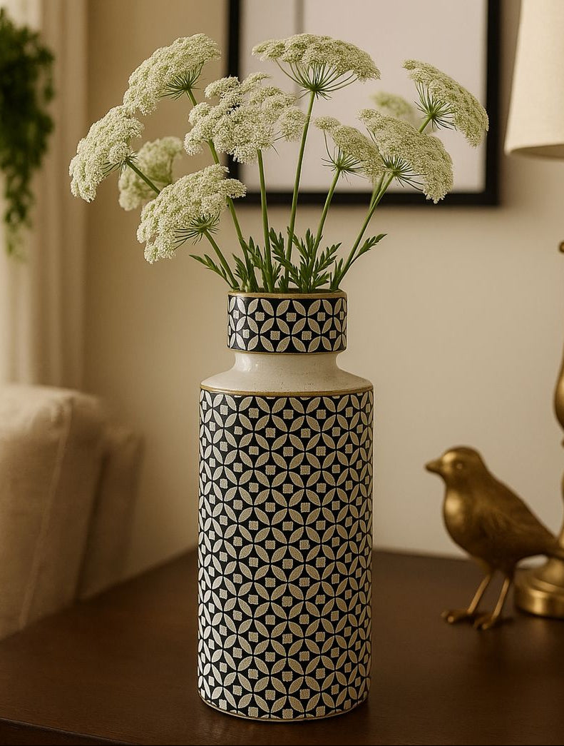 • Medium Hampton Flower Vase with black and white geometric pattern – 14cm x 32cm