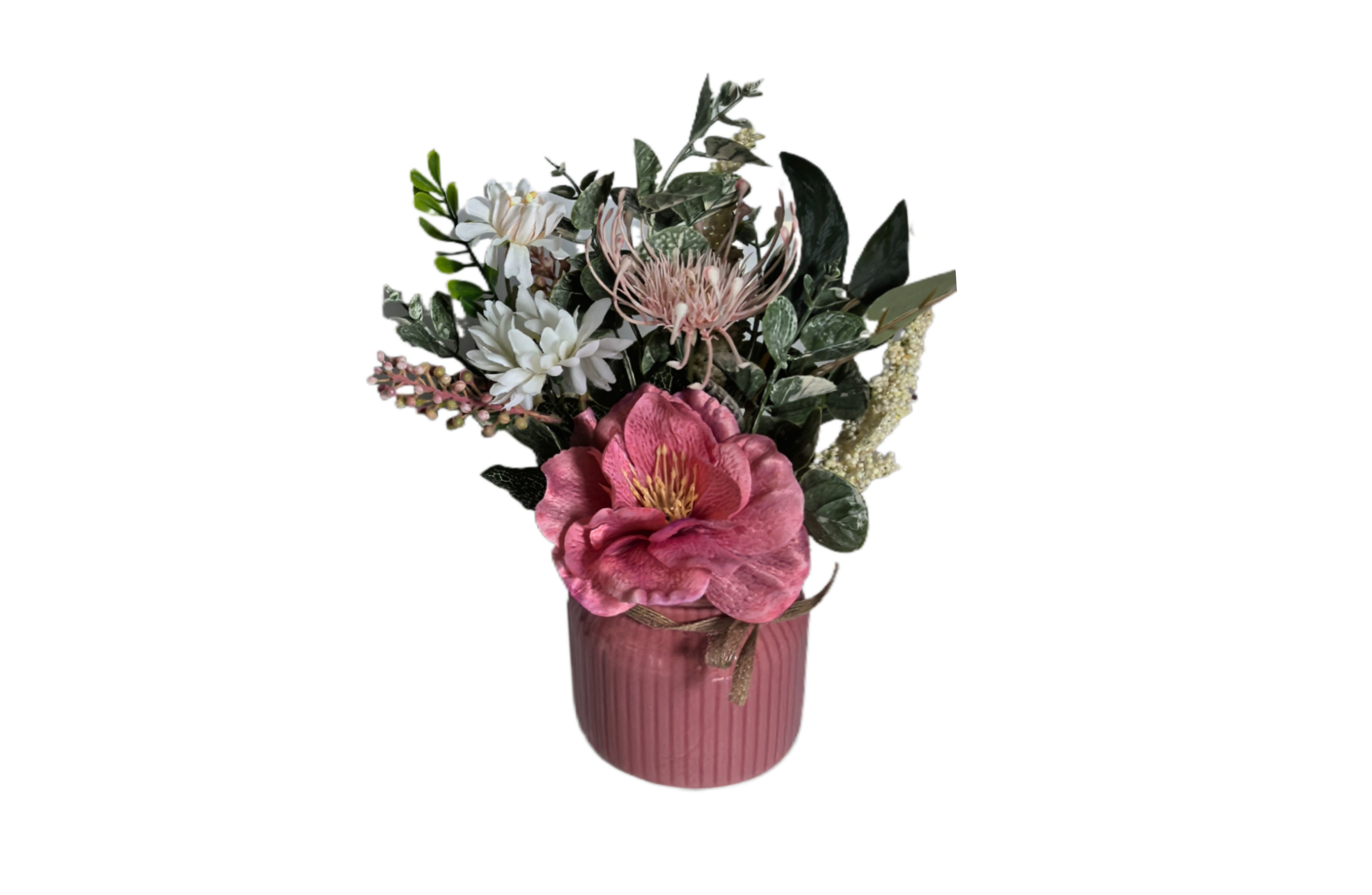 Designed with a balanced mix of lifelike blooms and soft greenery, this arrangement is ideal for small tables, shelves, vanities, or as a charming gift. Choose white for a look of serene elegance or pink for a pop of cheerful vibrance. Whichever you select, it brings lasting beauty and a polished finishing touch to any setting.
