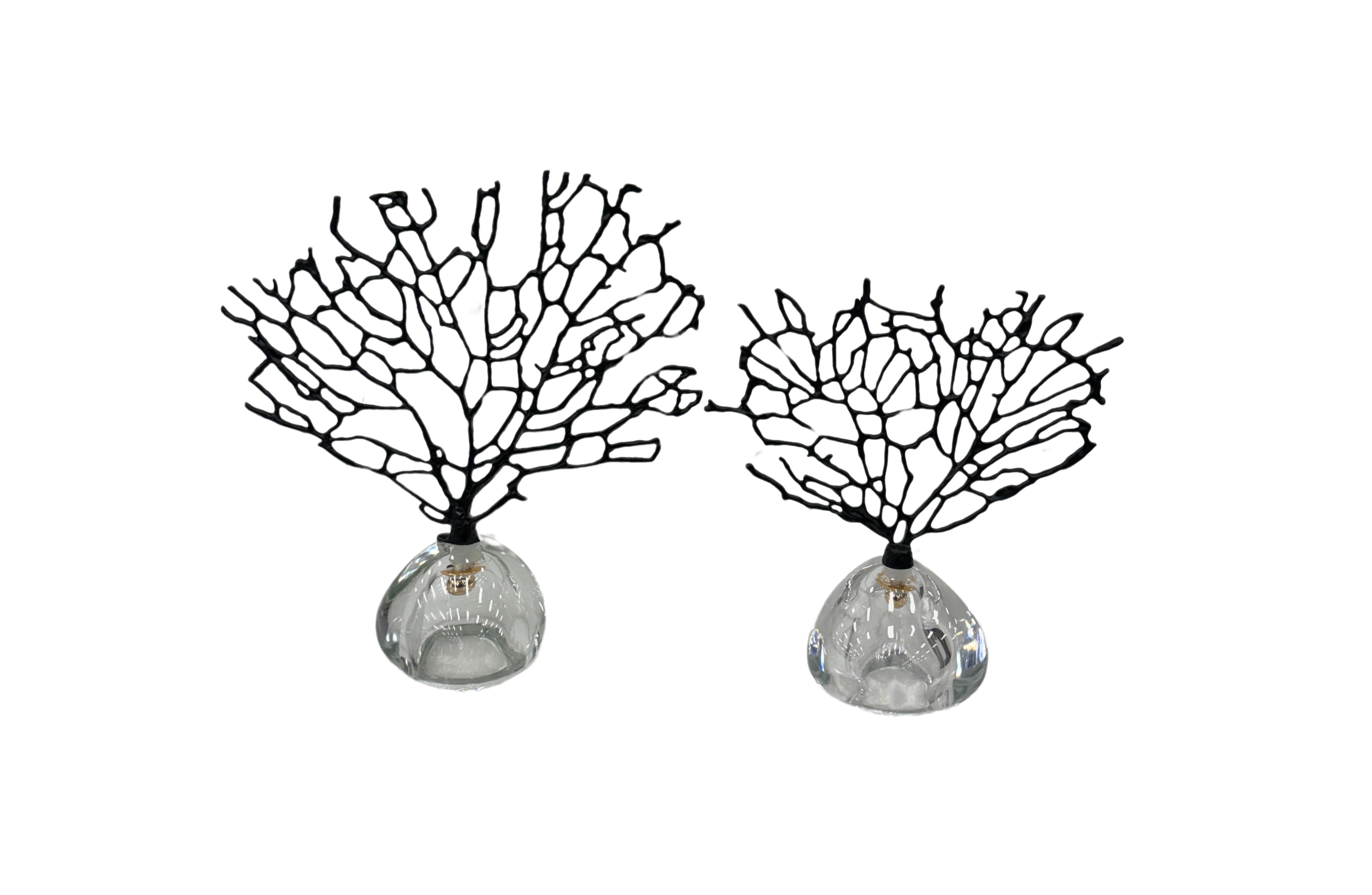 • Black Crystal Tree Table Décor set featuring two sizes with clear crystal bases and intricate black tree branches