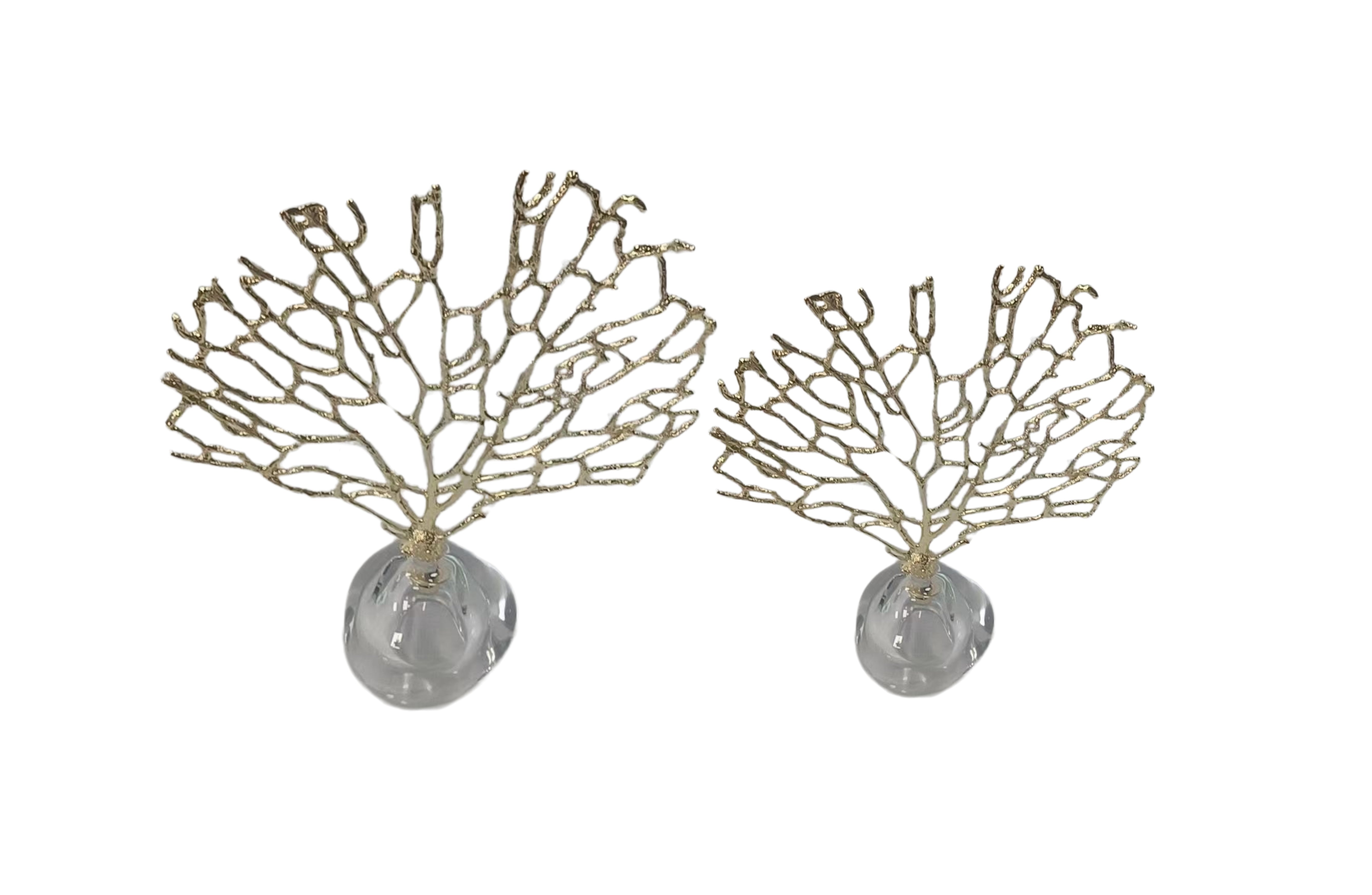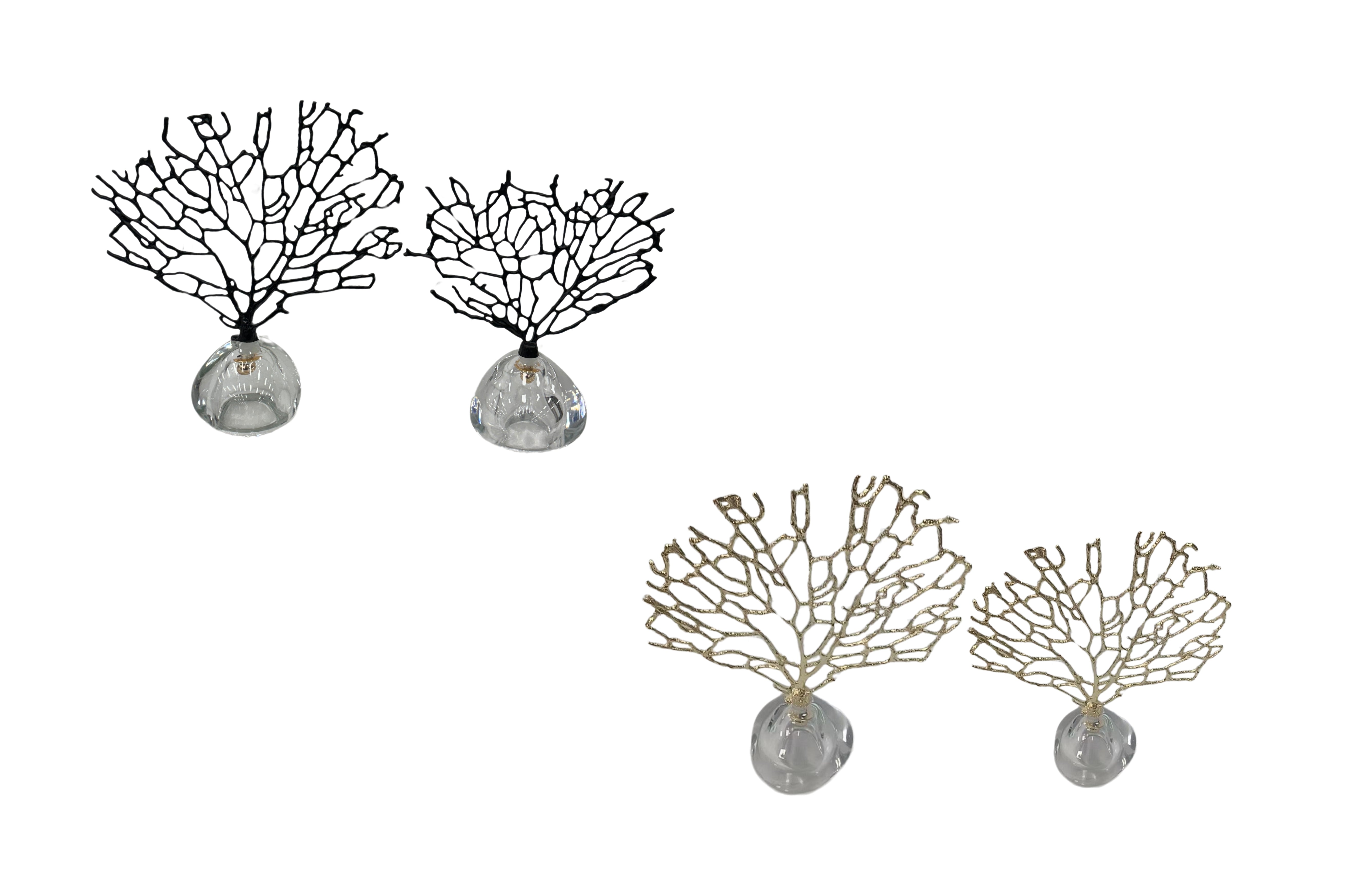 Set of two Gold Crystal Tree Table Décor pieces featuring intricate golden branches with clear glass bases, perfect for elegant tabletop styling