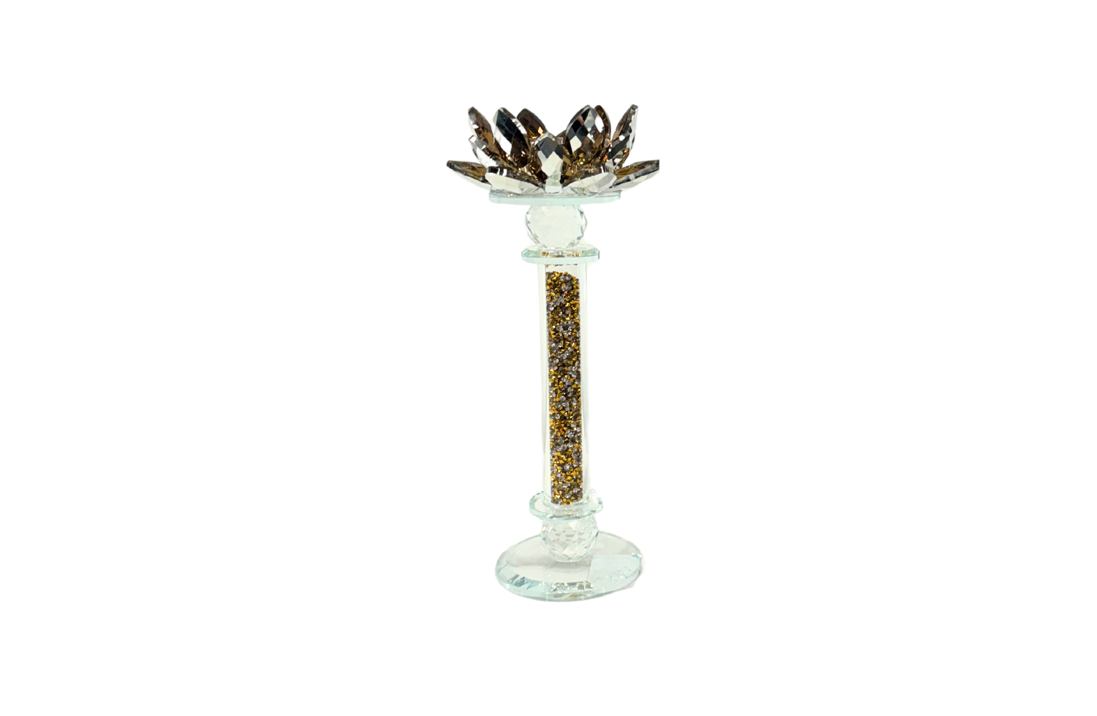 • Elegant tall gold crystal candle holder with lotus design