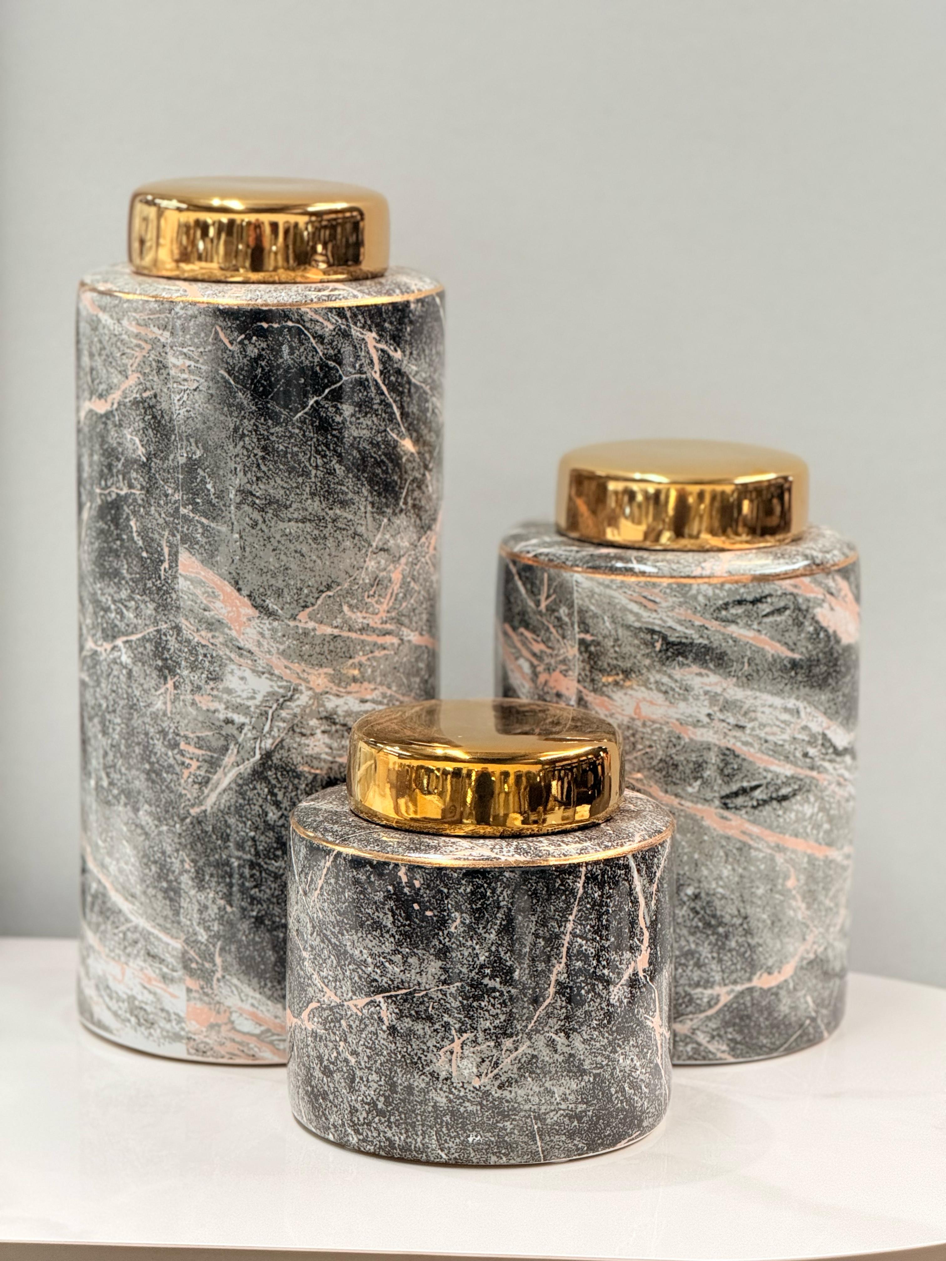 • Elegant black marble ceramic canisters with gold lids, set of three.
