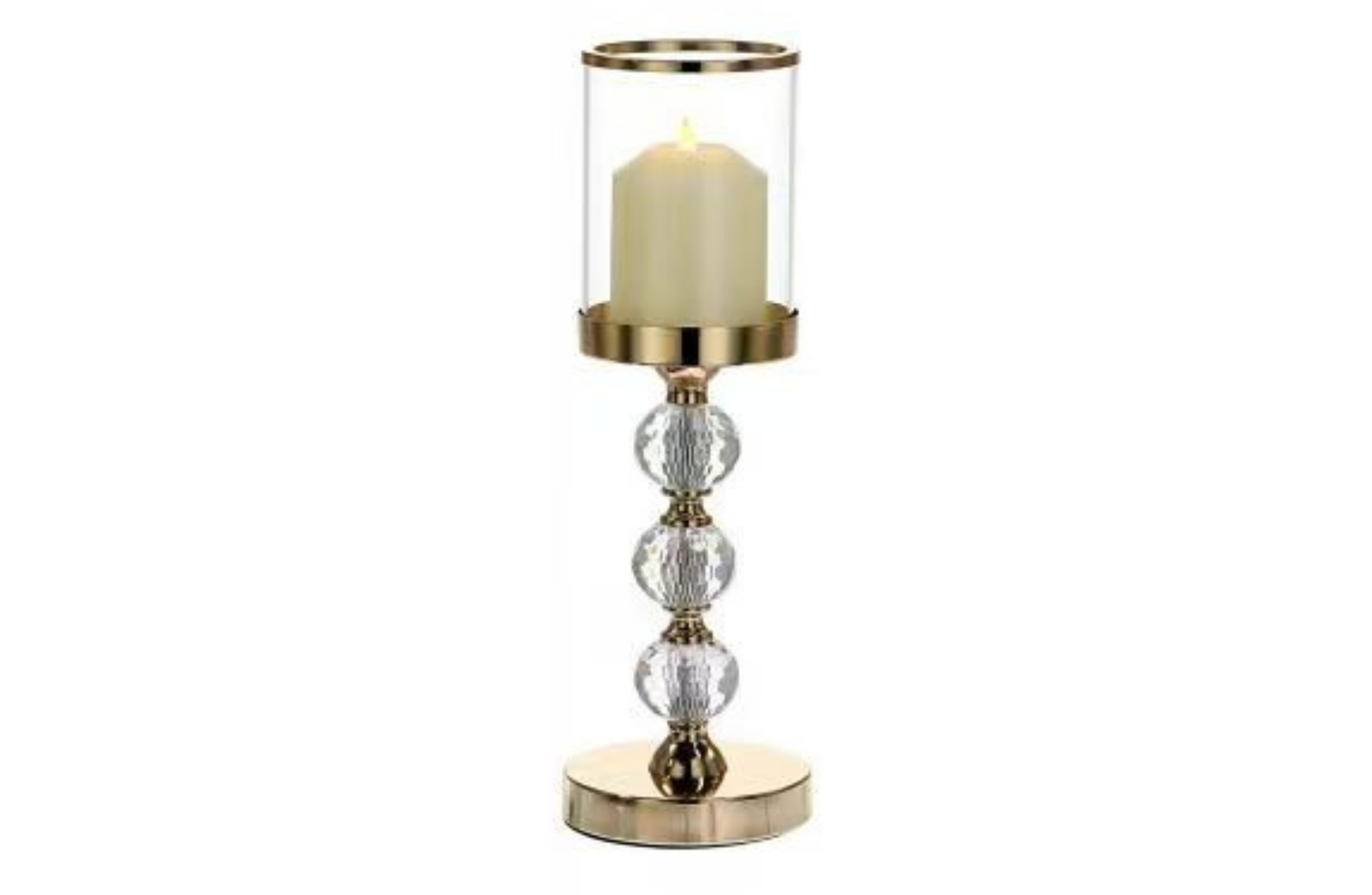 Each piece features a sturdy metallic base and a sleek cylindrical glass shade that securely holds pillar candles. The design is further enhanced by stacked crystal-ball accents that beautifully catch and reflect the light, creating a sparkling display. Ideal for mantels, dining tables, console setups, or event styling, the Zena collection offers an exquisite blend of function and style.
