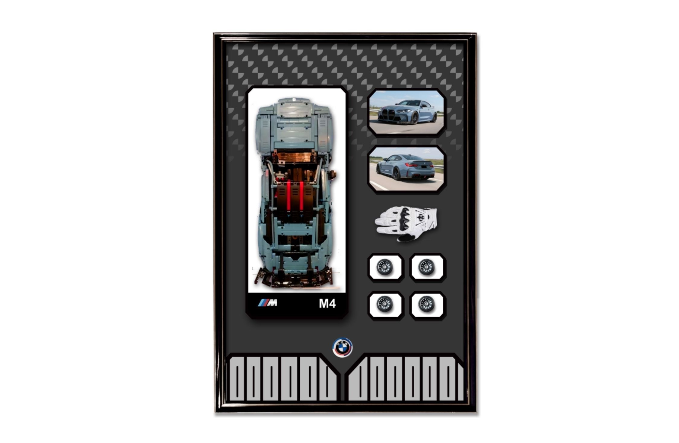 Open media with position 1 in modal popup BMW inspired brick built racing car wall art in black frame with detailed M4 model display and components.