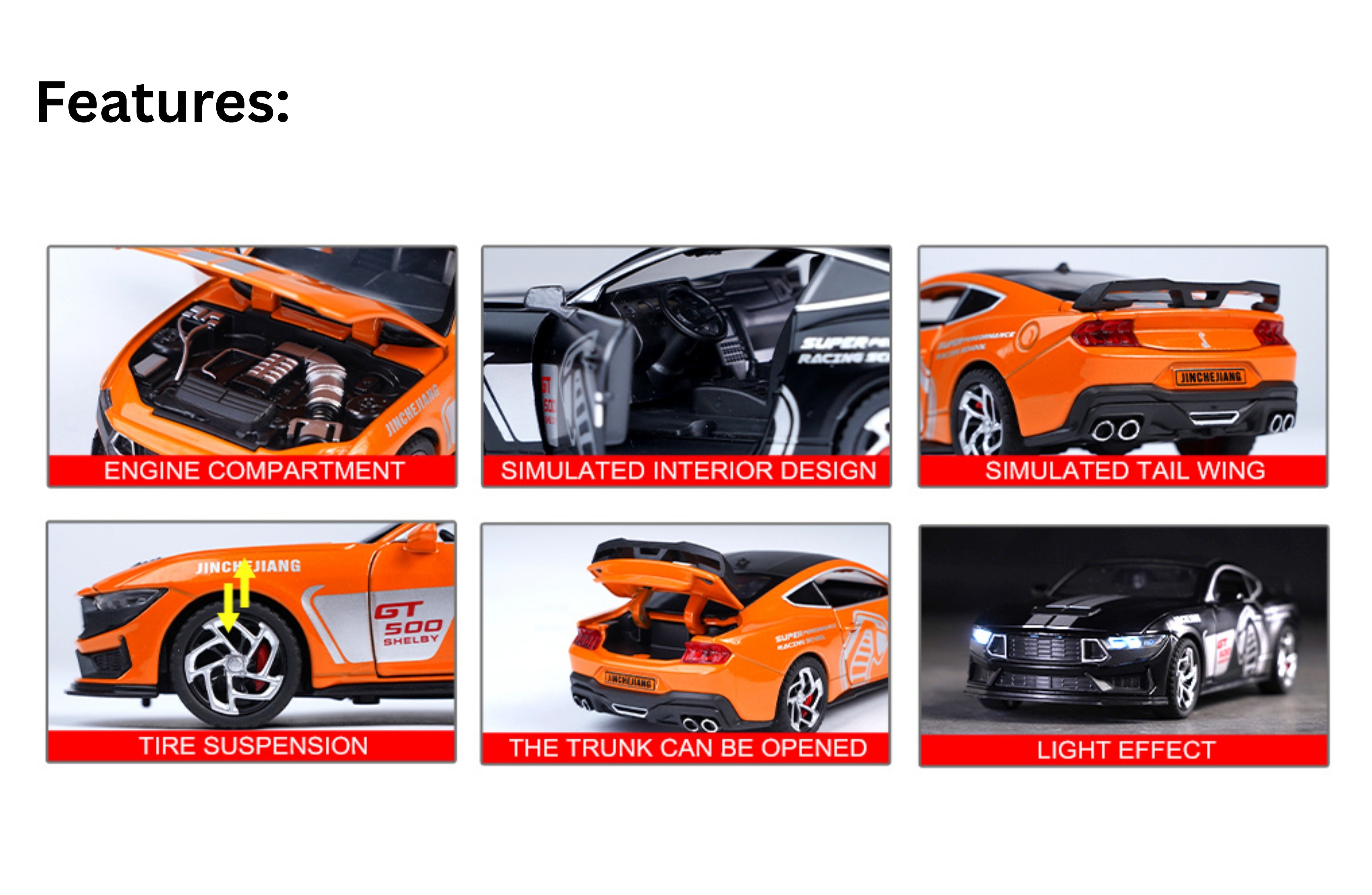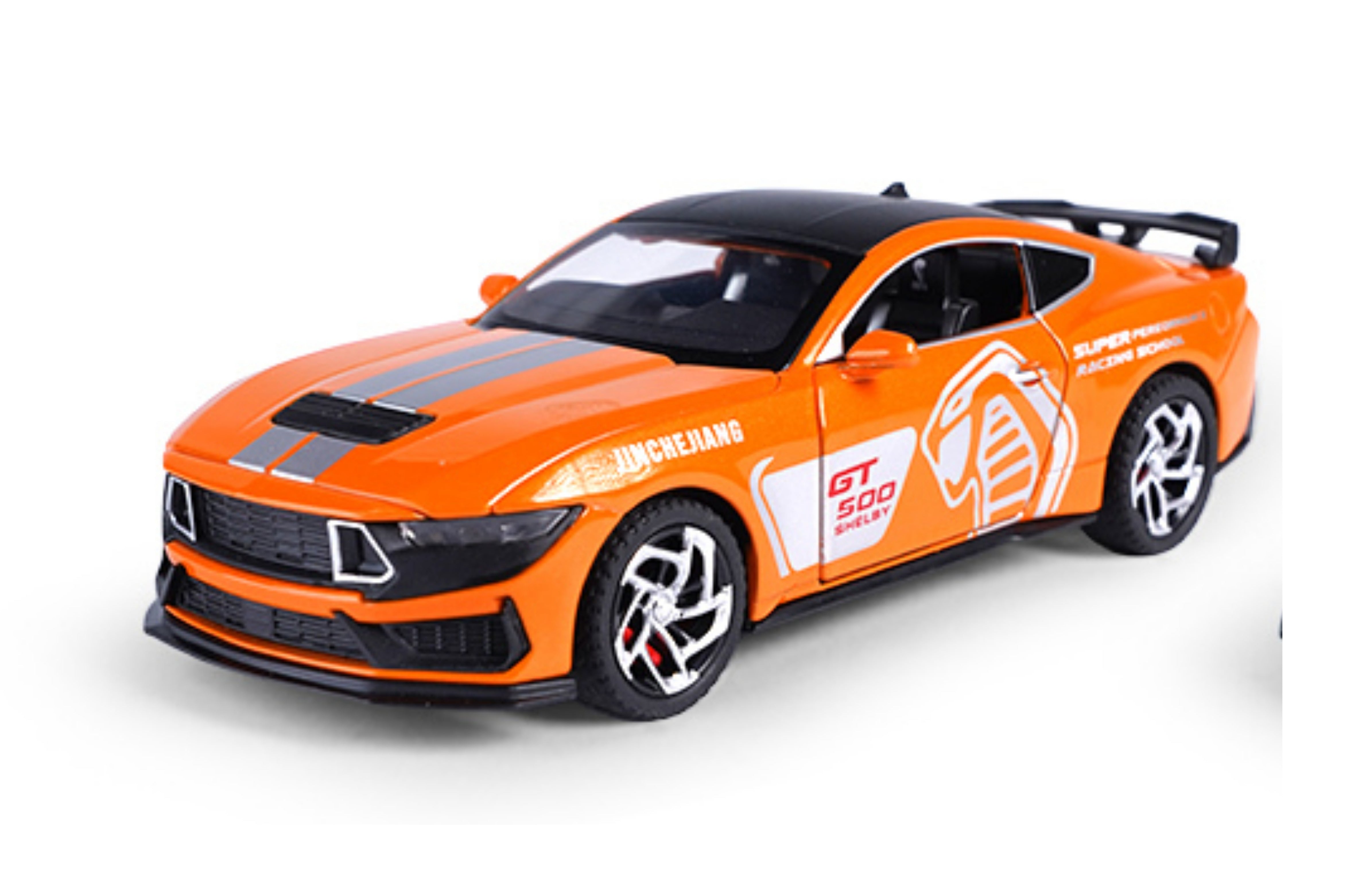 Bring American muscle to your toy car collection with the Ford Mustang Shelby GT500 Diecast 1:32. Featuring bold Shelby-inspired styling, this detailed model delivers exciting play with realistic sound and light effects, tyre suspension, and pull-back power simulation—perfect for fast runs across the lounge room floor or a stylish display on a shelf.