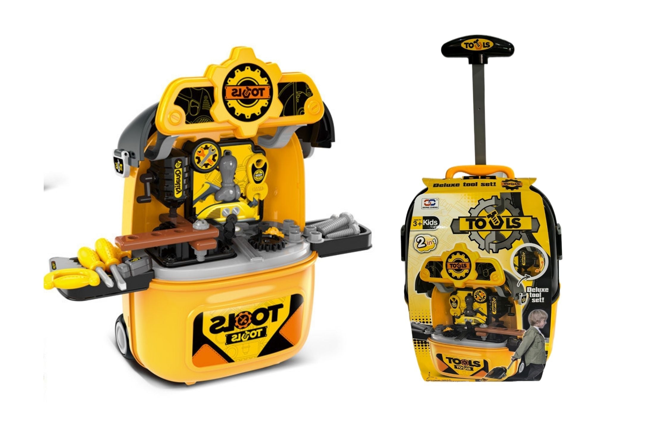 • 2-in-1 design: pretend tools set + suitcase trolley for storage and portability