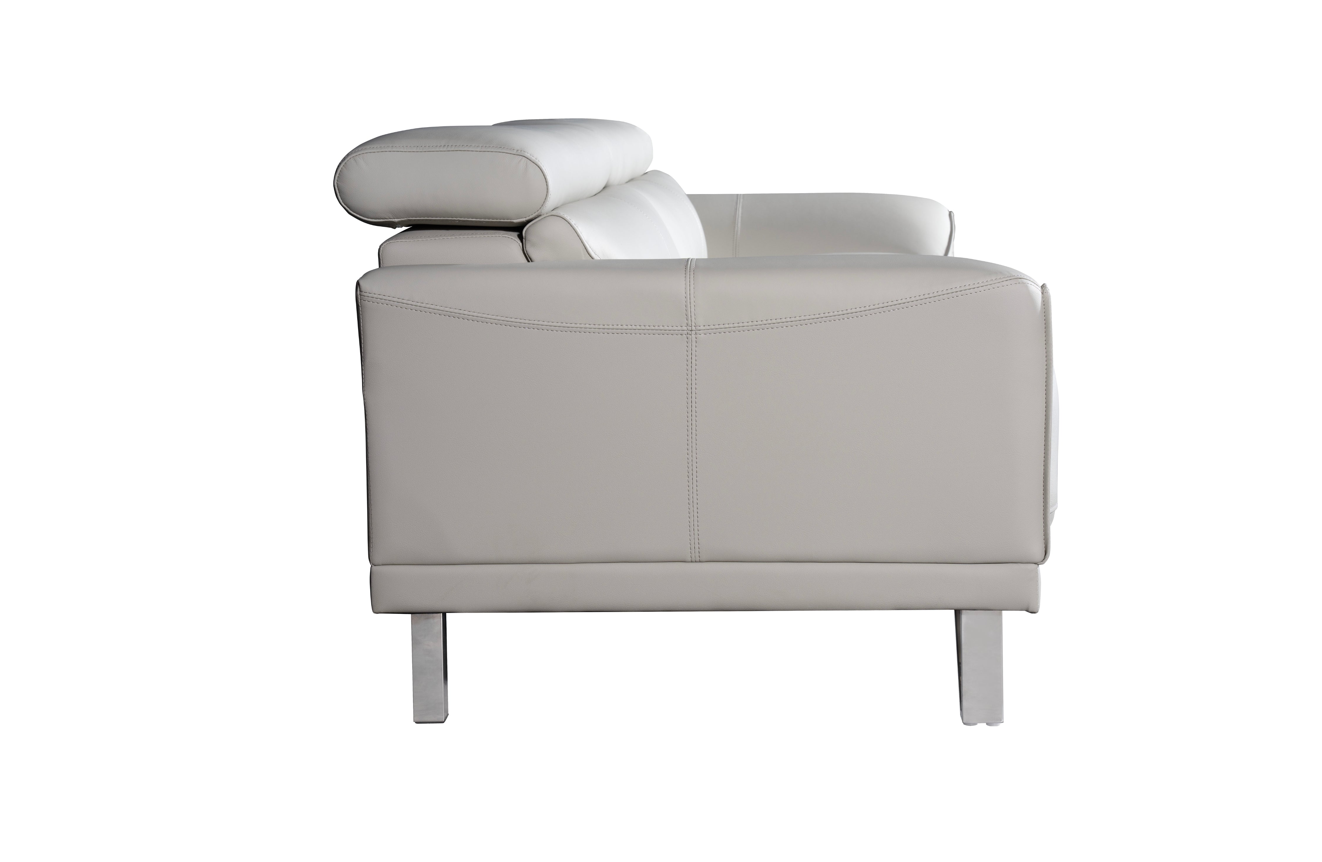 • Side view of Lawson light grey leather sofa featuring adjustable headrest and stainless steel legs.