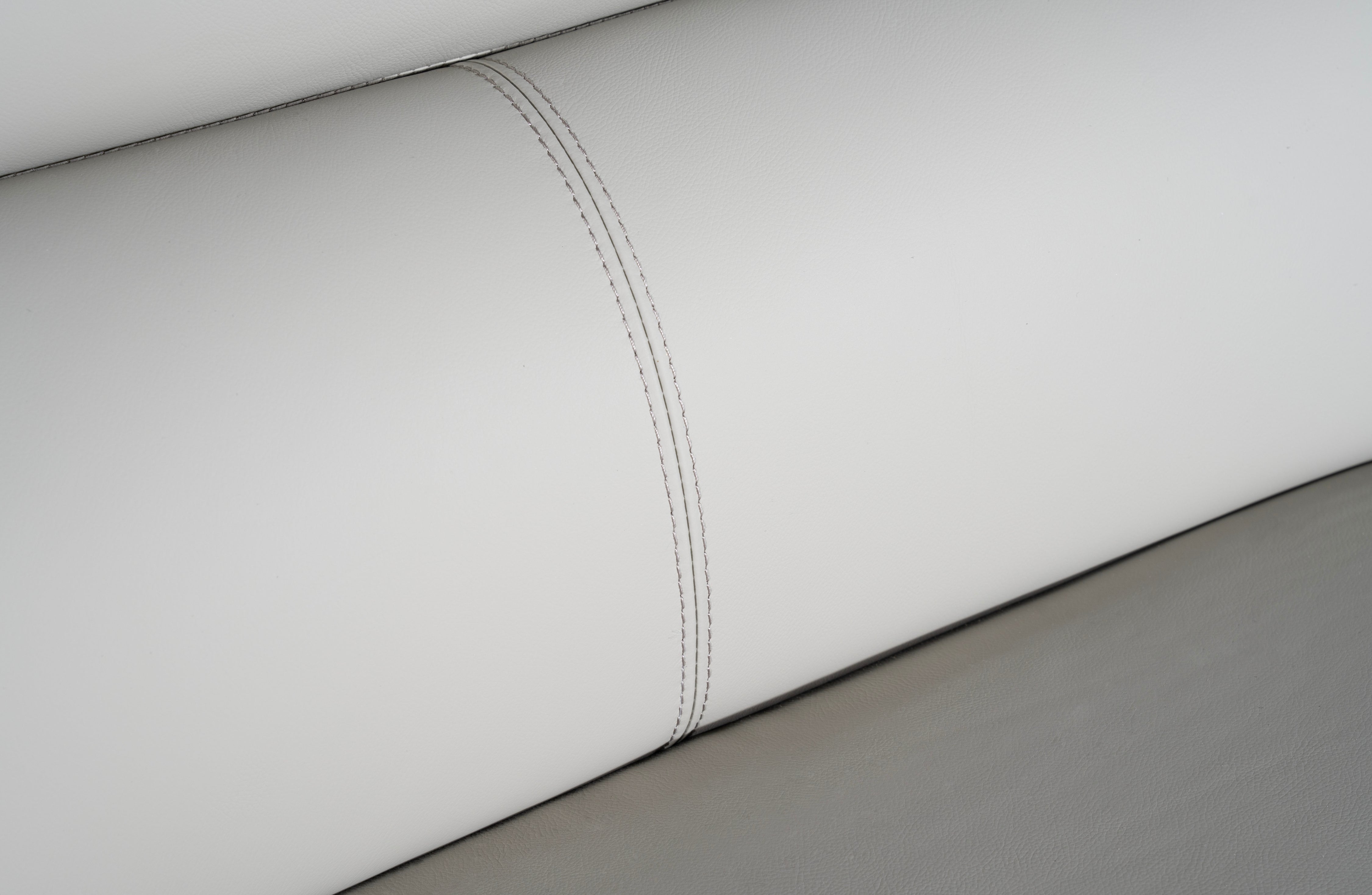 • Close-up view of Lawson light grey leather sofa showing fine stitching detail and smooth upholstery.