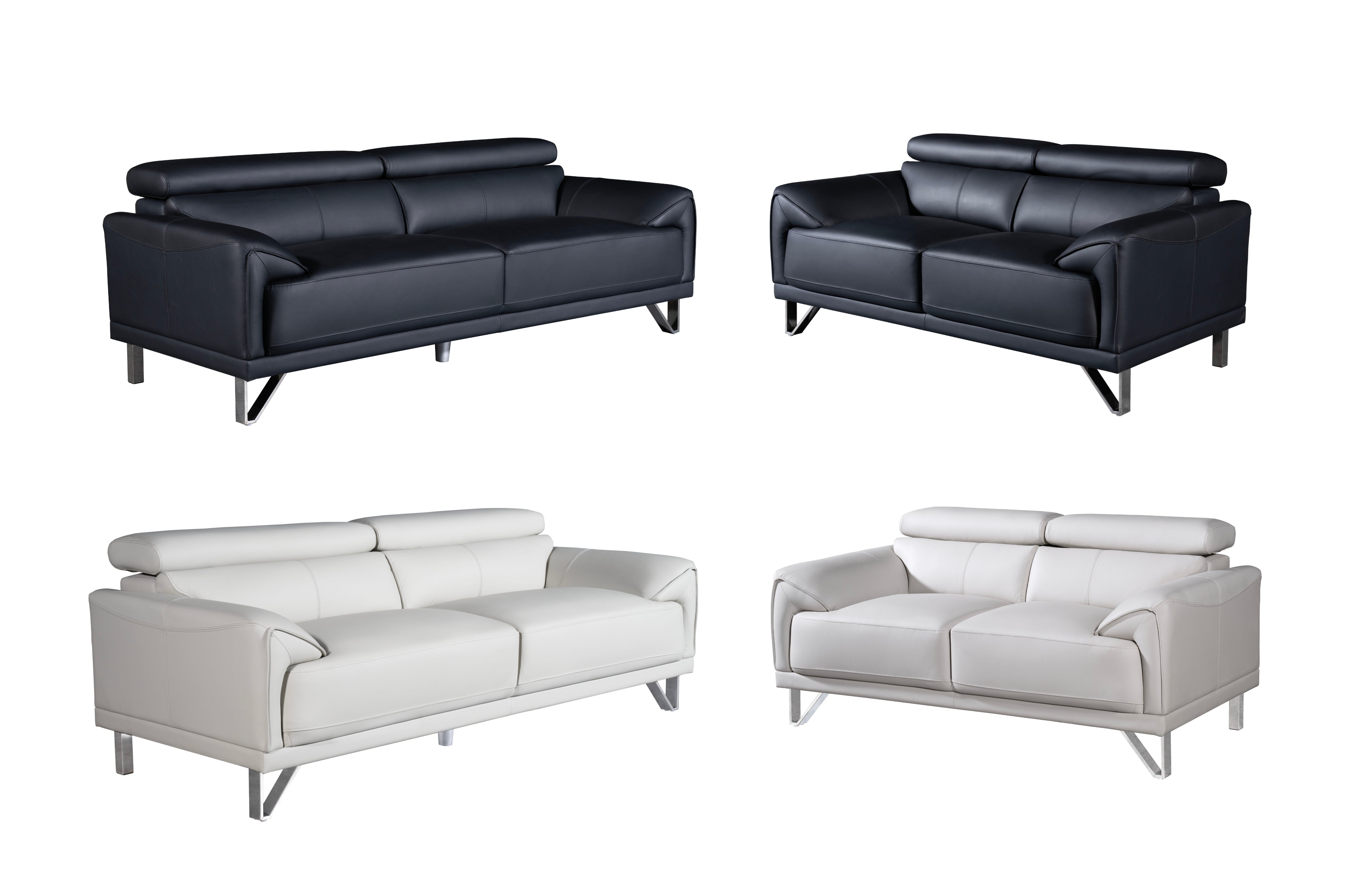 Lawson leather sofa set in black and light grey featuring adjustable headrests and stainless steel legs.