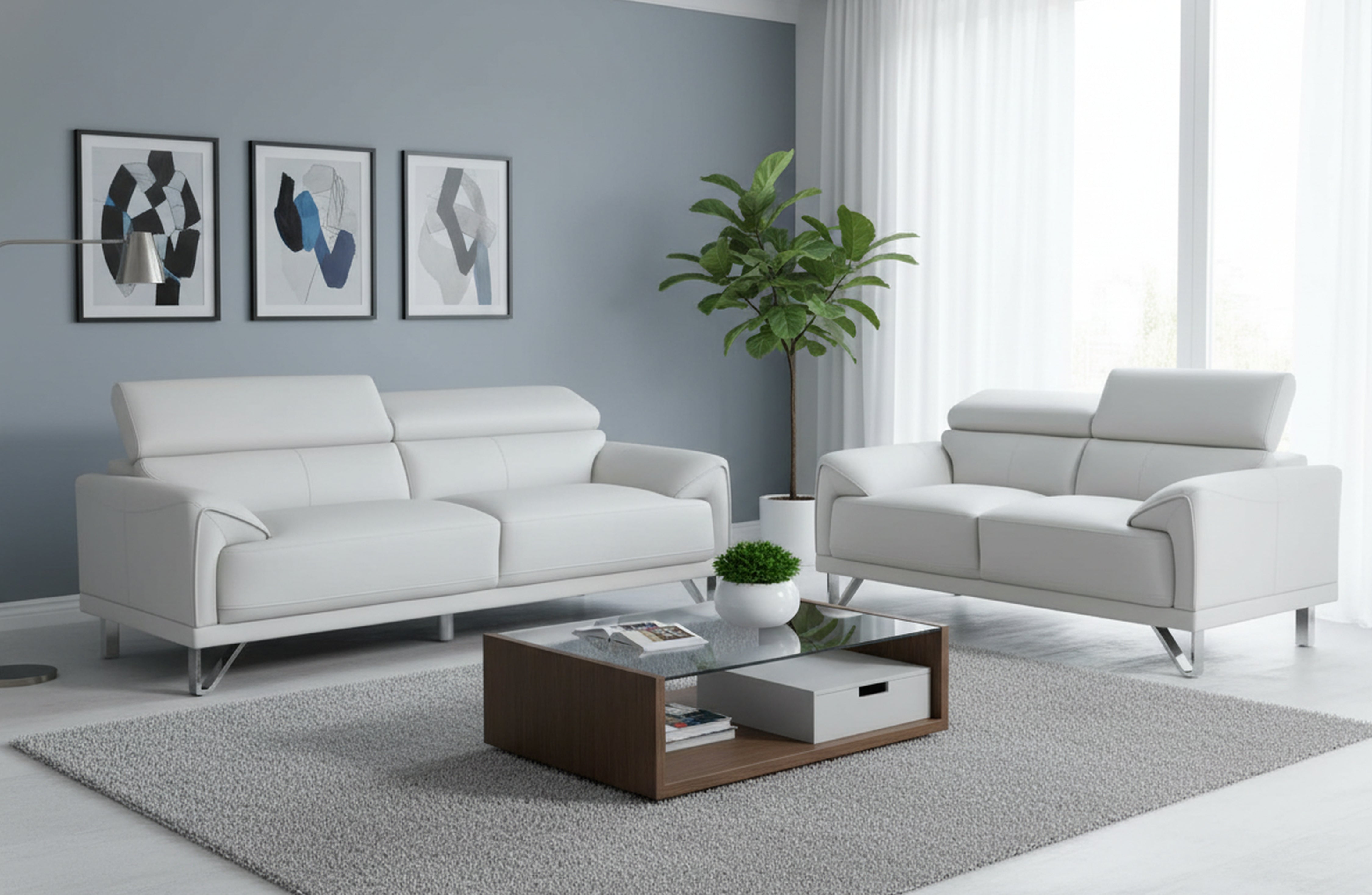 Lawson light grey leather 3-seater and 2-seater sofas styled in a bright modern living room.