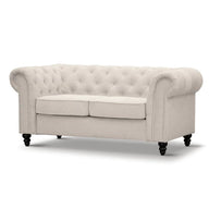 Beige Chesterfield tufted two-seater sofa with rolled arms and timber legs