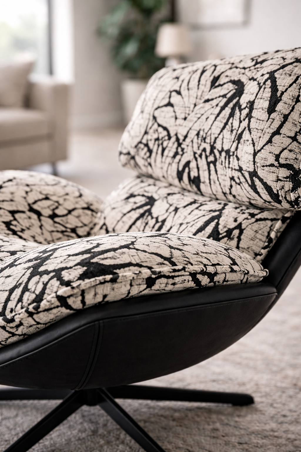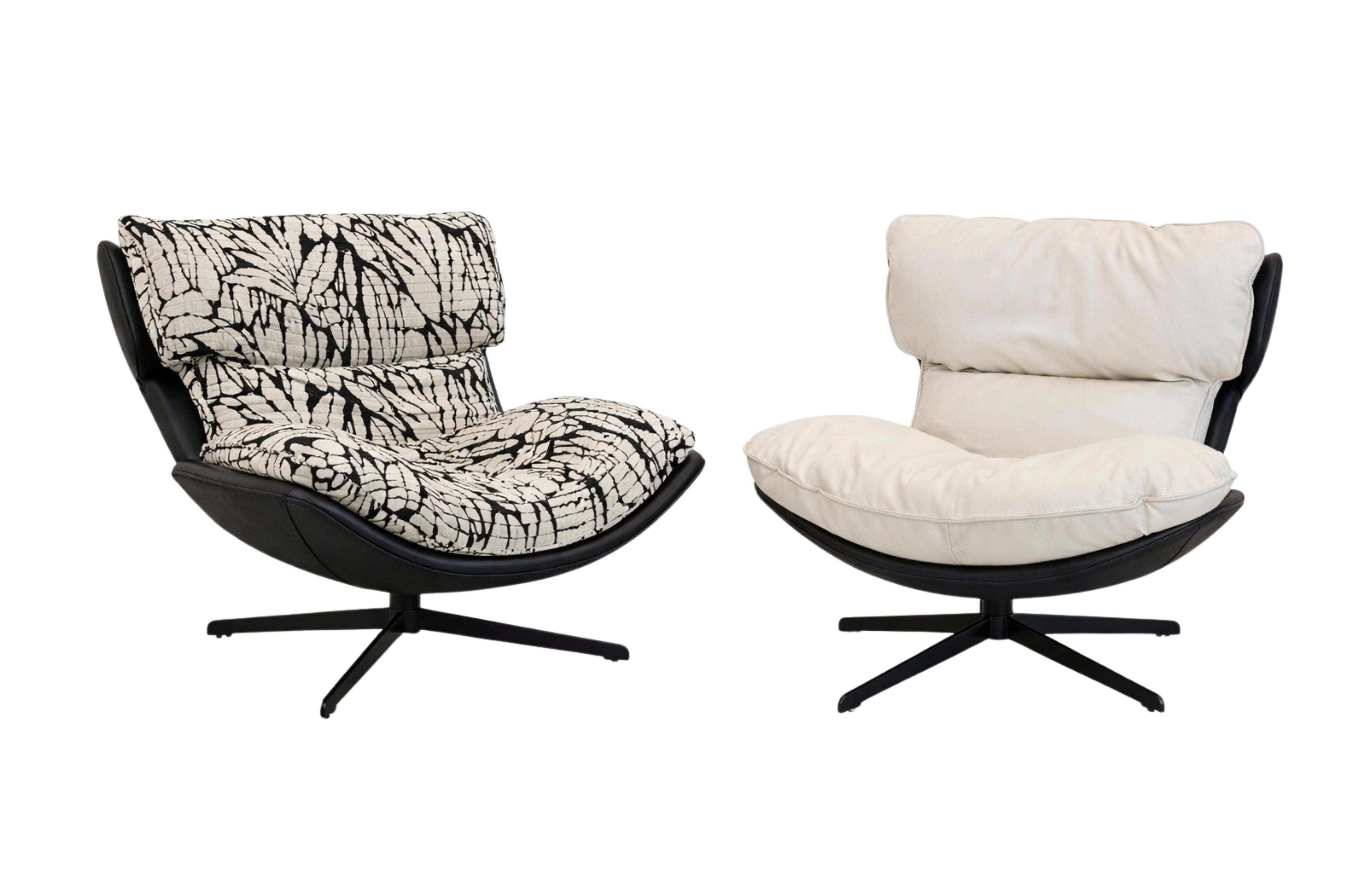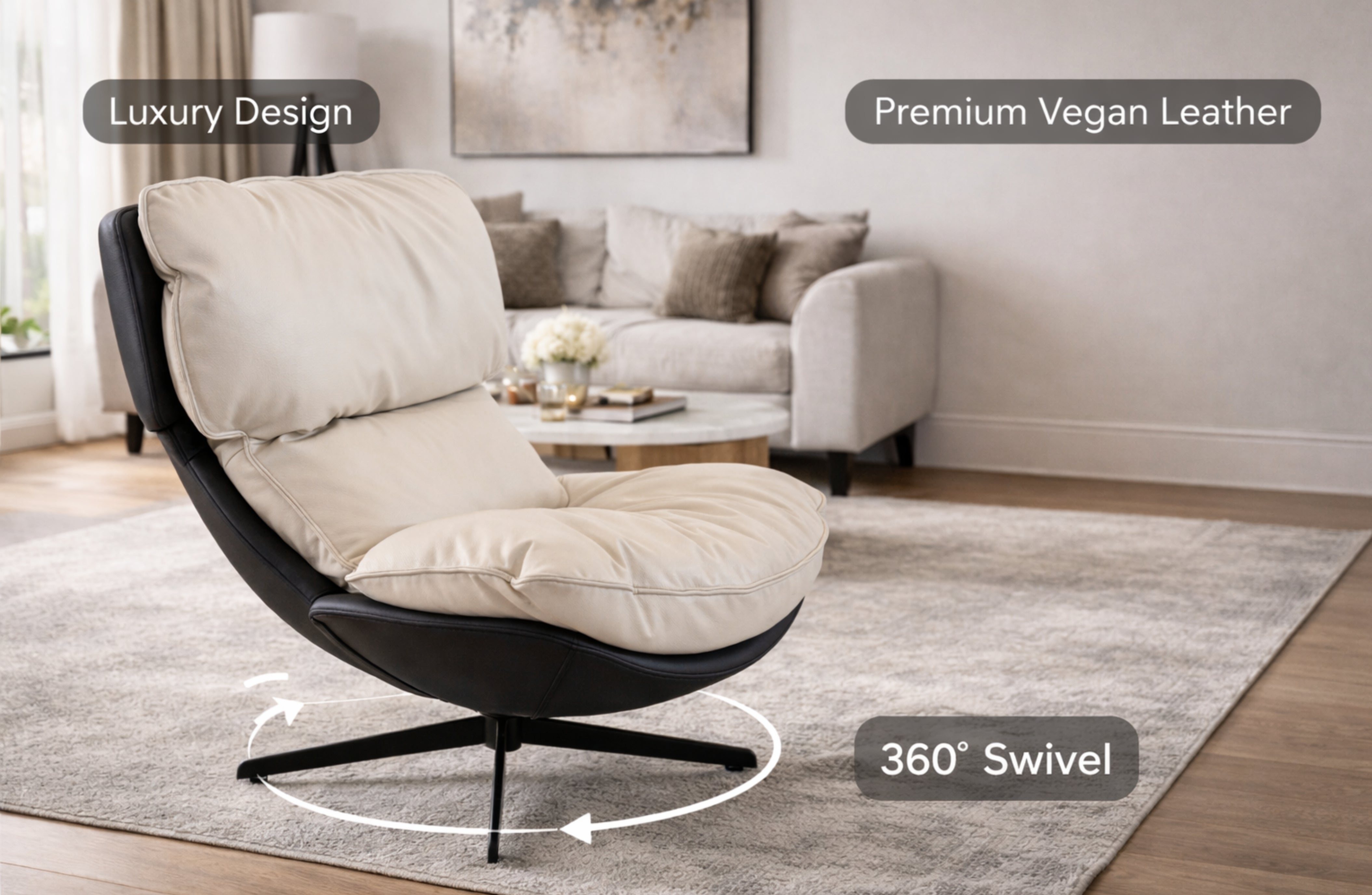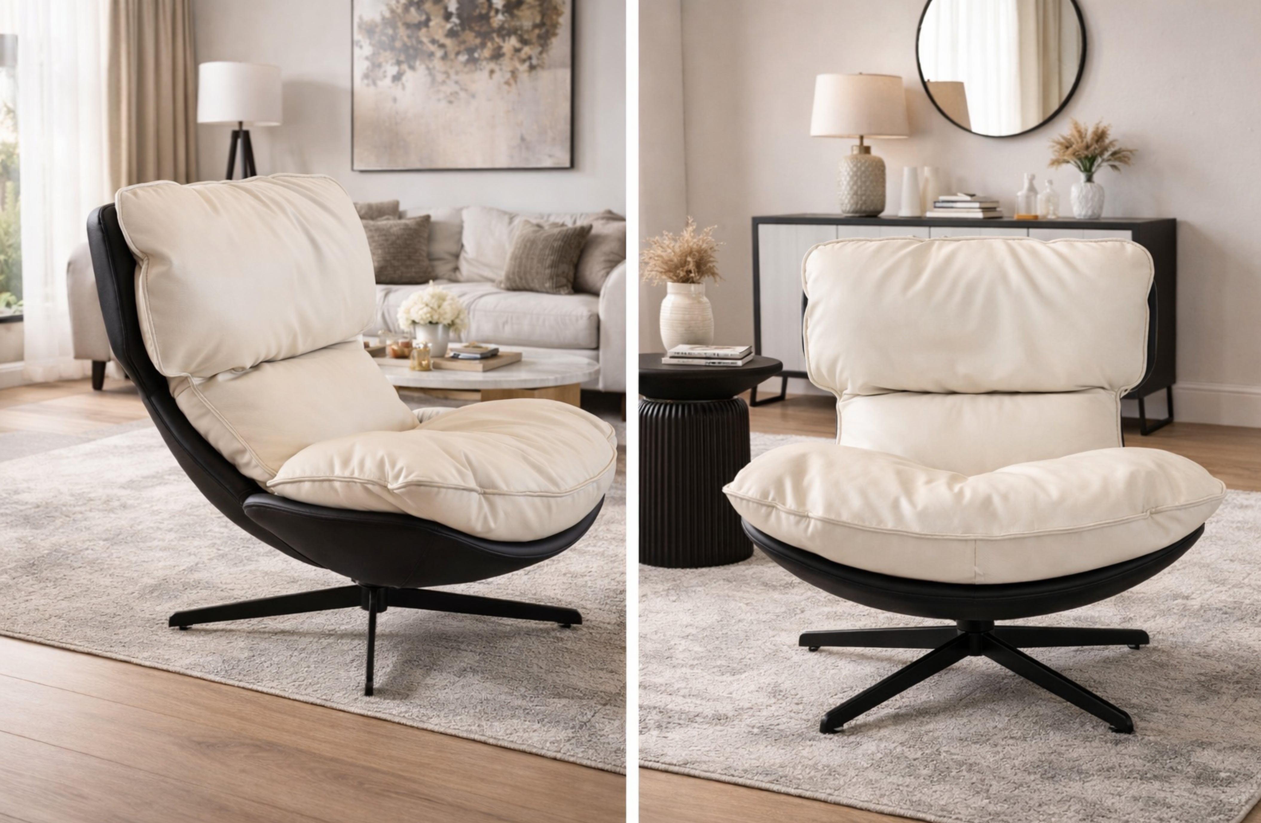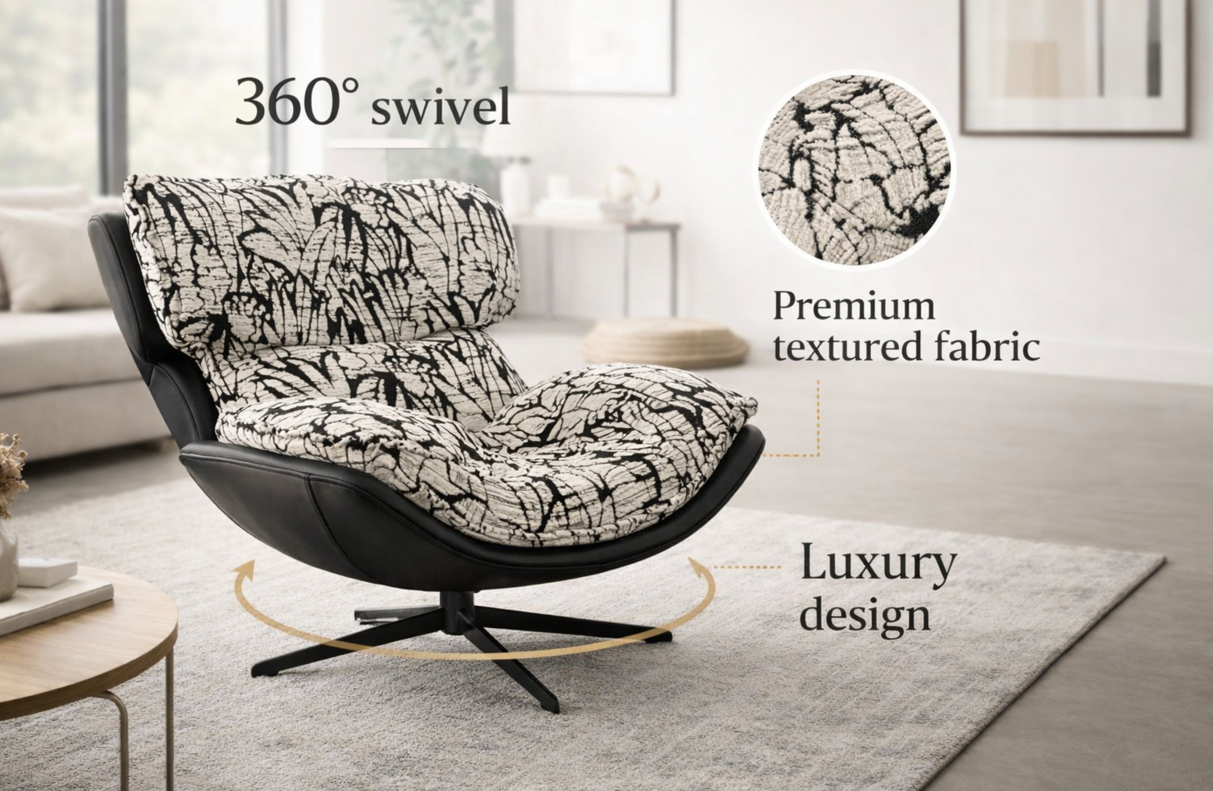 Upgrade your living space with the Enzo Swivel Arm Chair, a modern and stylish piece designed for comfort and everyday practicality. Featuring your choice of textured black/white fabric or smooth cream vegan leather, this chair enhances any contemporary interior while offering exceptional support and visual appeal. The 360° swivel base provides easy movement, making it ideal for living rooms, offices, bedrooms, reading corners, and lounge areas. Its deep cushioning and rounded silhouette combine to deliver comfort, elegance, and versatility in one striking design.