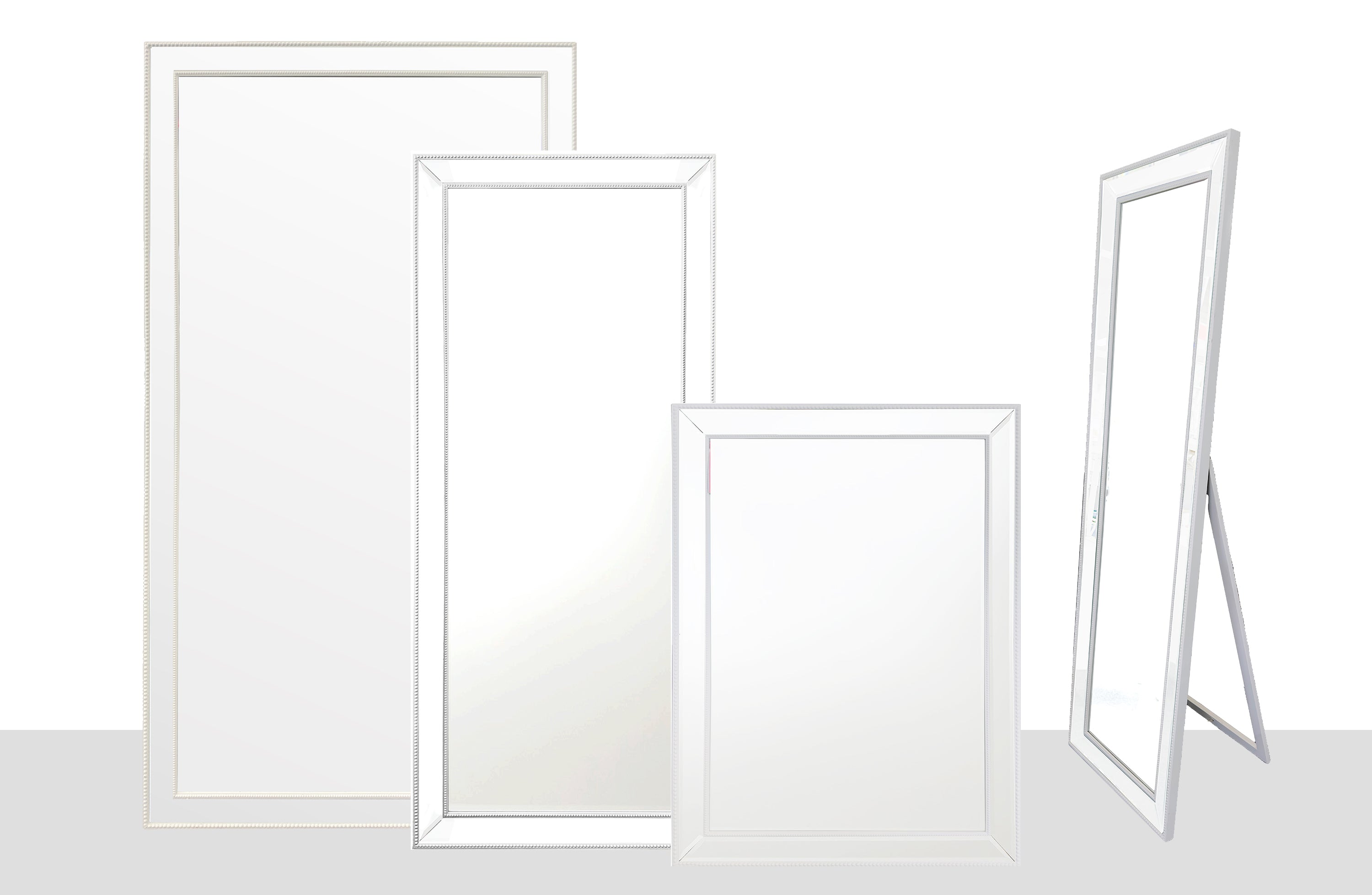 • White beaded framed mirrors in multiple sizes including full length and wall designs