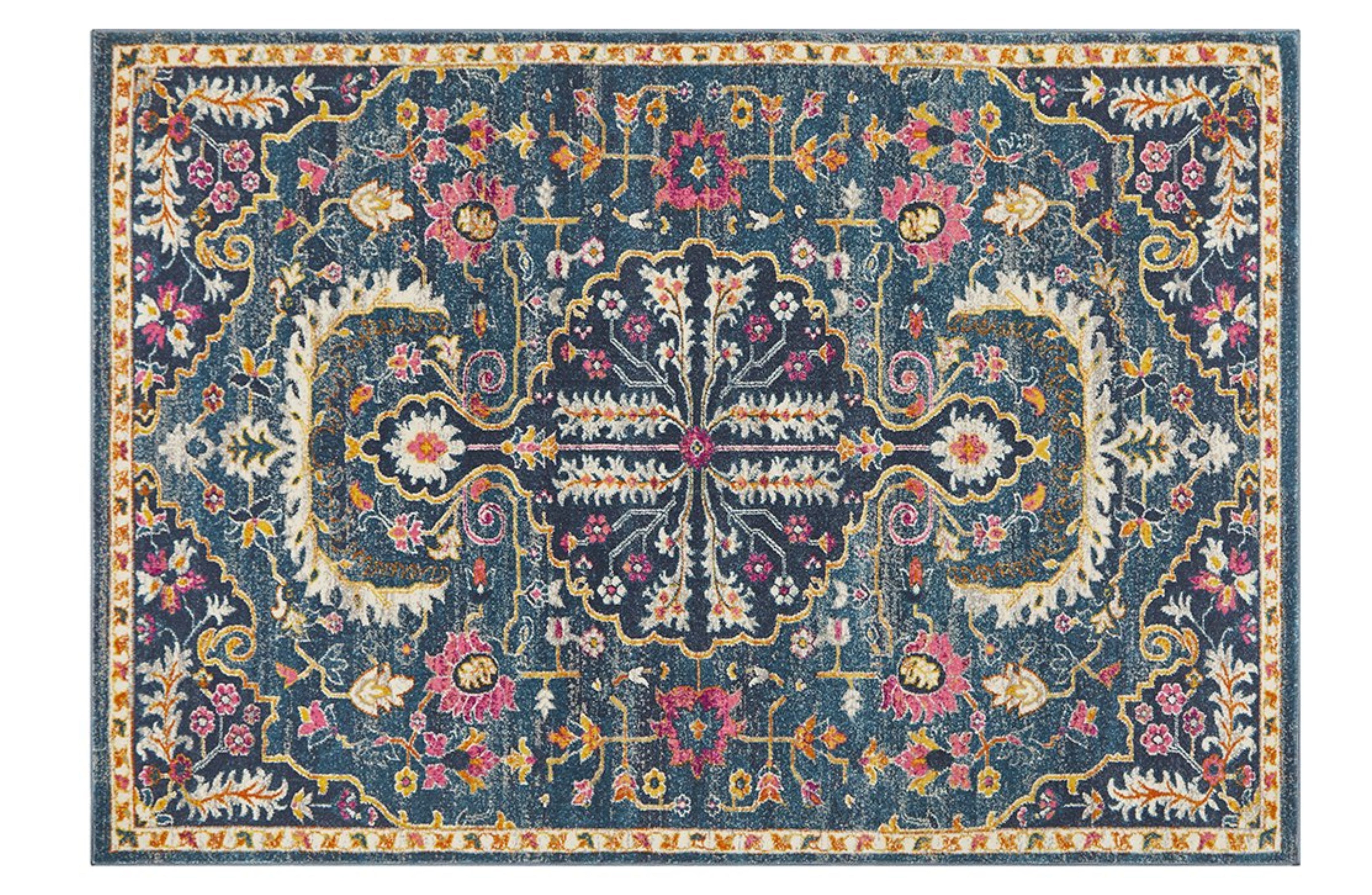 • Flat lay of Babylon Navy Rug with ornate floral design