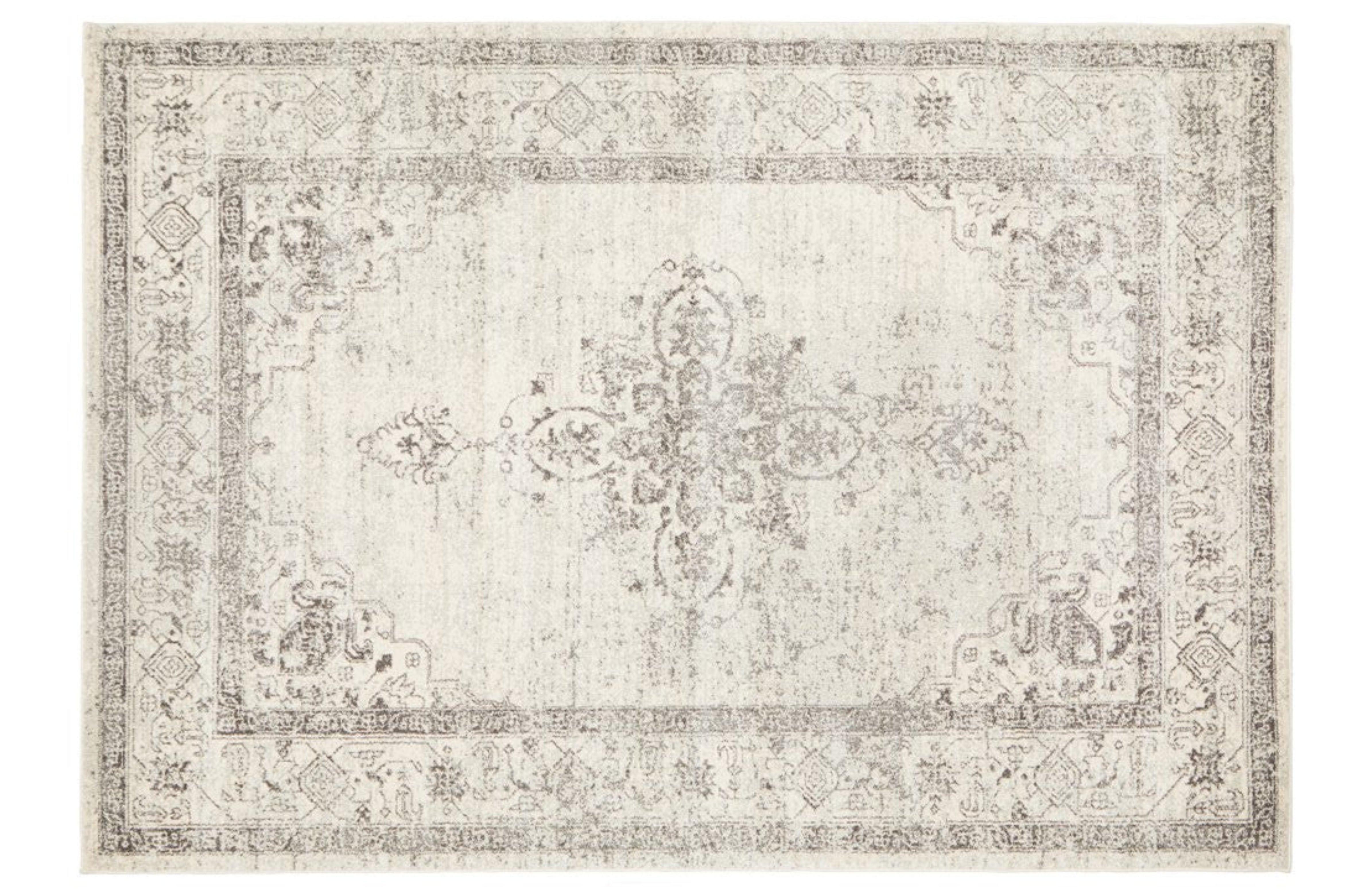 • Close-up of Century 977 Silver Rug with detailed patterns beneath a wooden table leg.