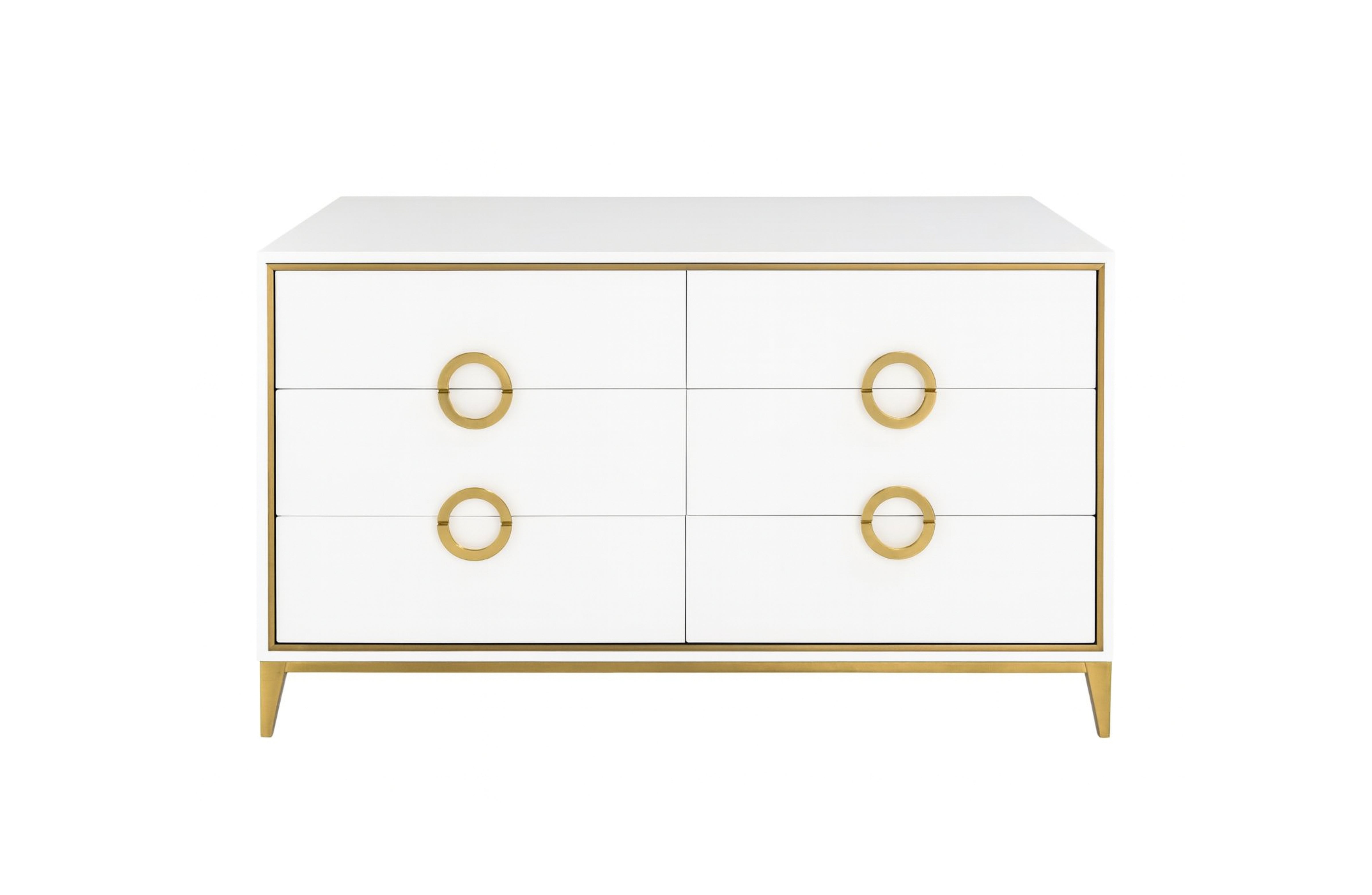 Balmain white dresser with gold trim showcasing six drawers and round gold handles for elegant storage.