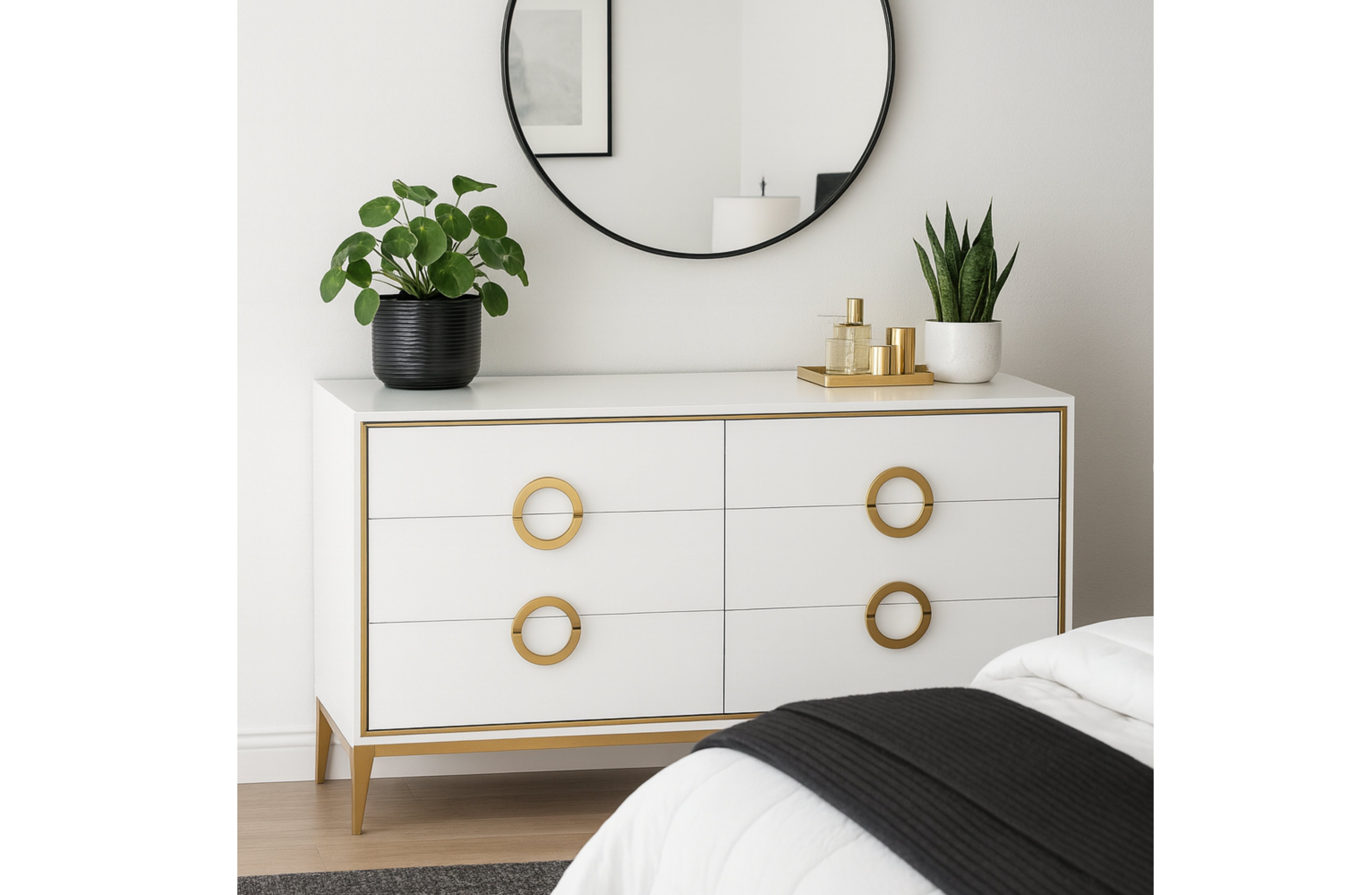 • Balmain white dresser with gold trim styled with plants, décor tray, and mirror in a modern bedroom.