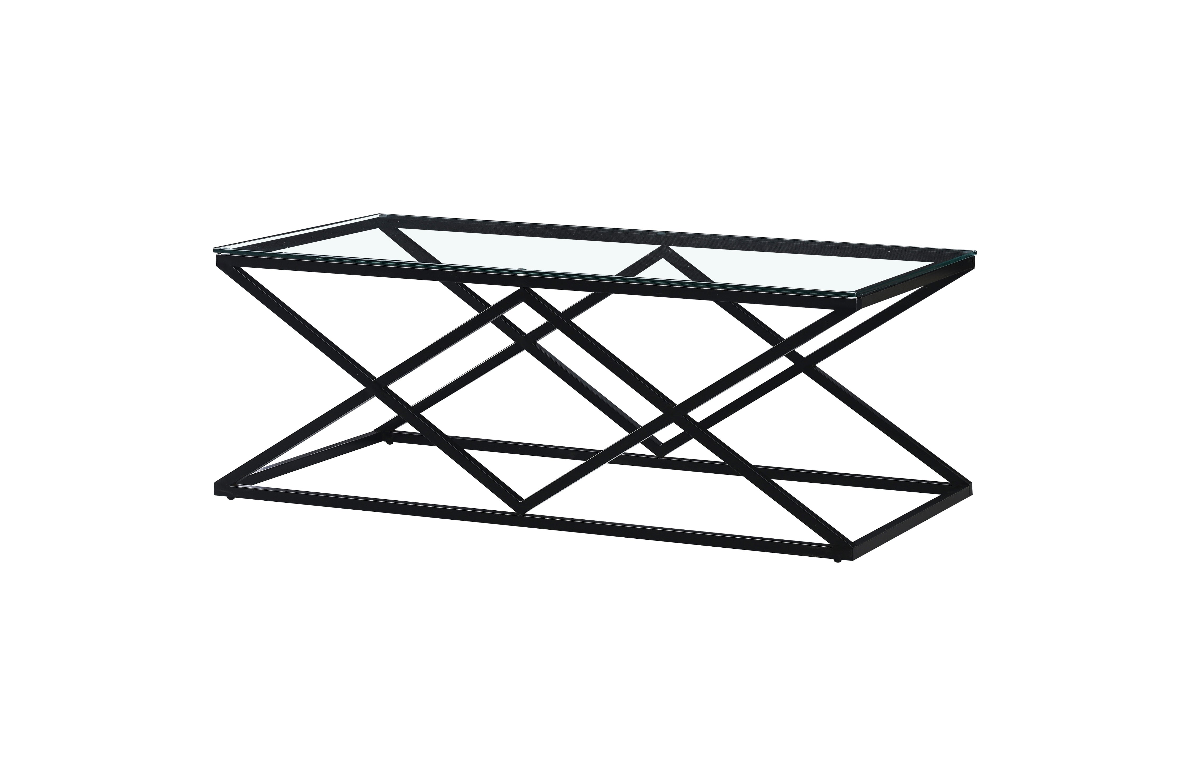 Beverly coffee table in matte black frame with clear tempered glass top.