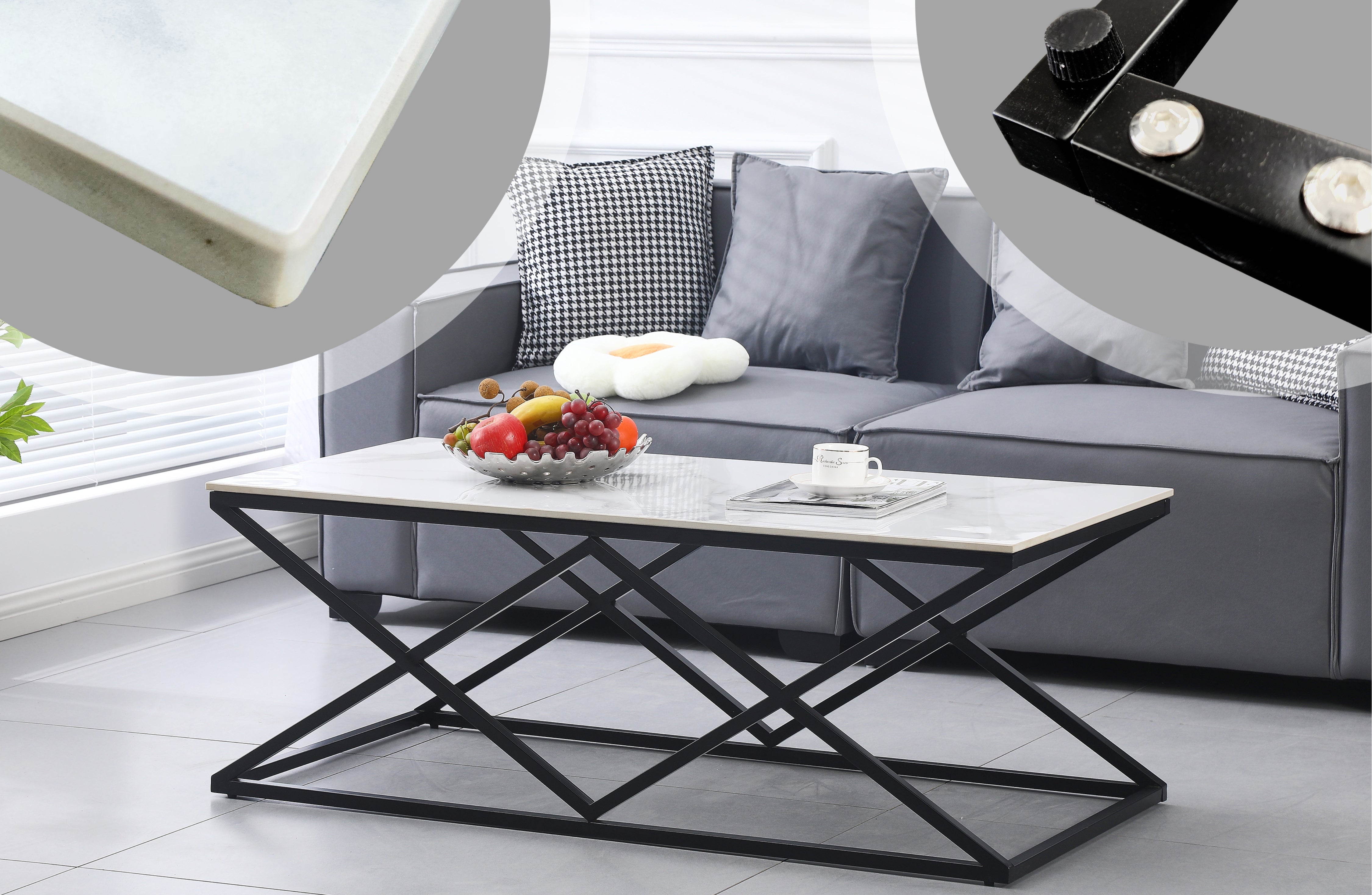 Beverly coffee table in matte black frame with sintered white marble stone top.