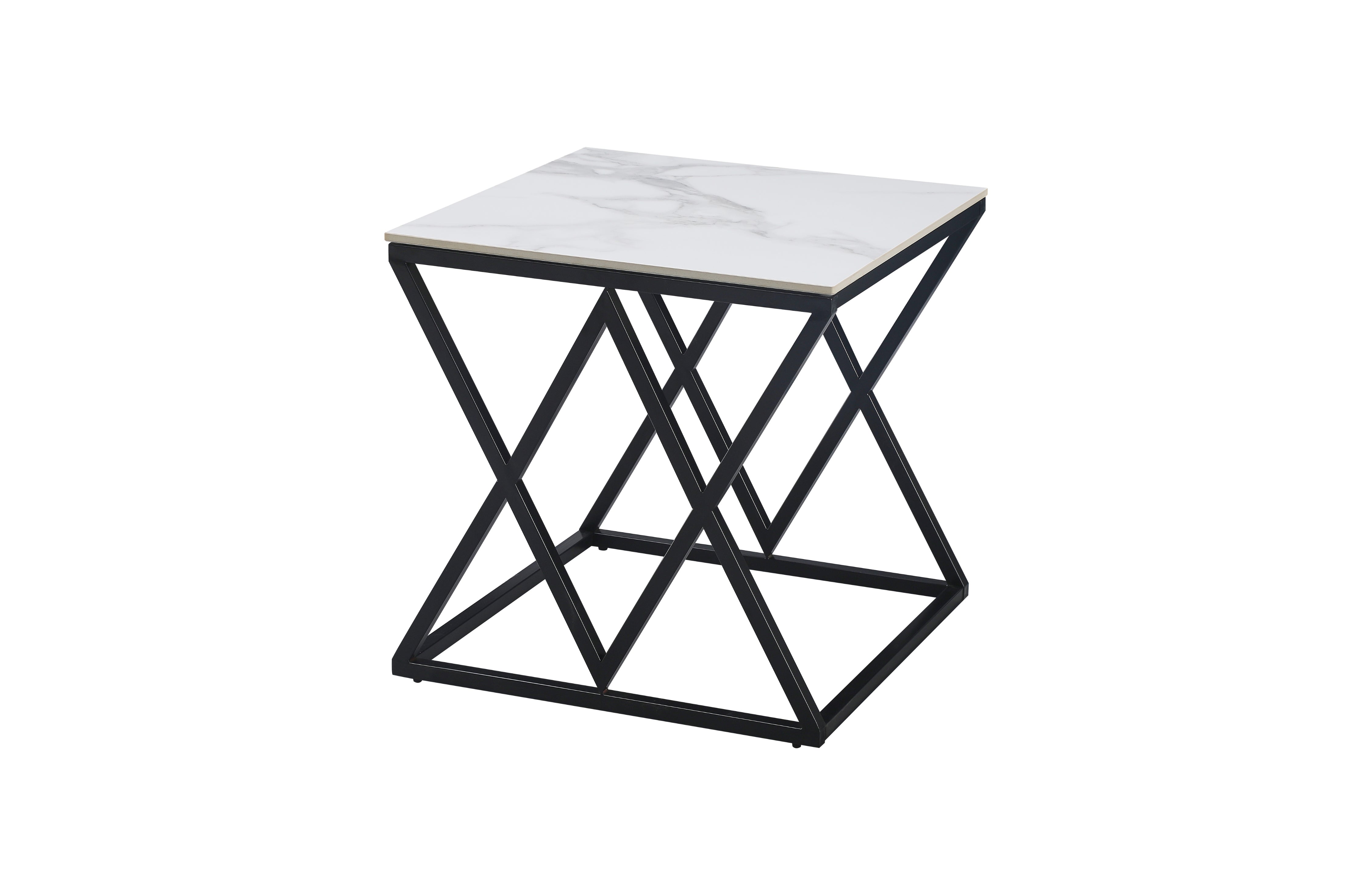 Beverly side table in matte black frame with sintered white marble stone top, contemporary look.