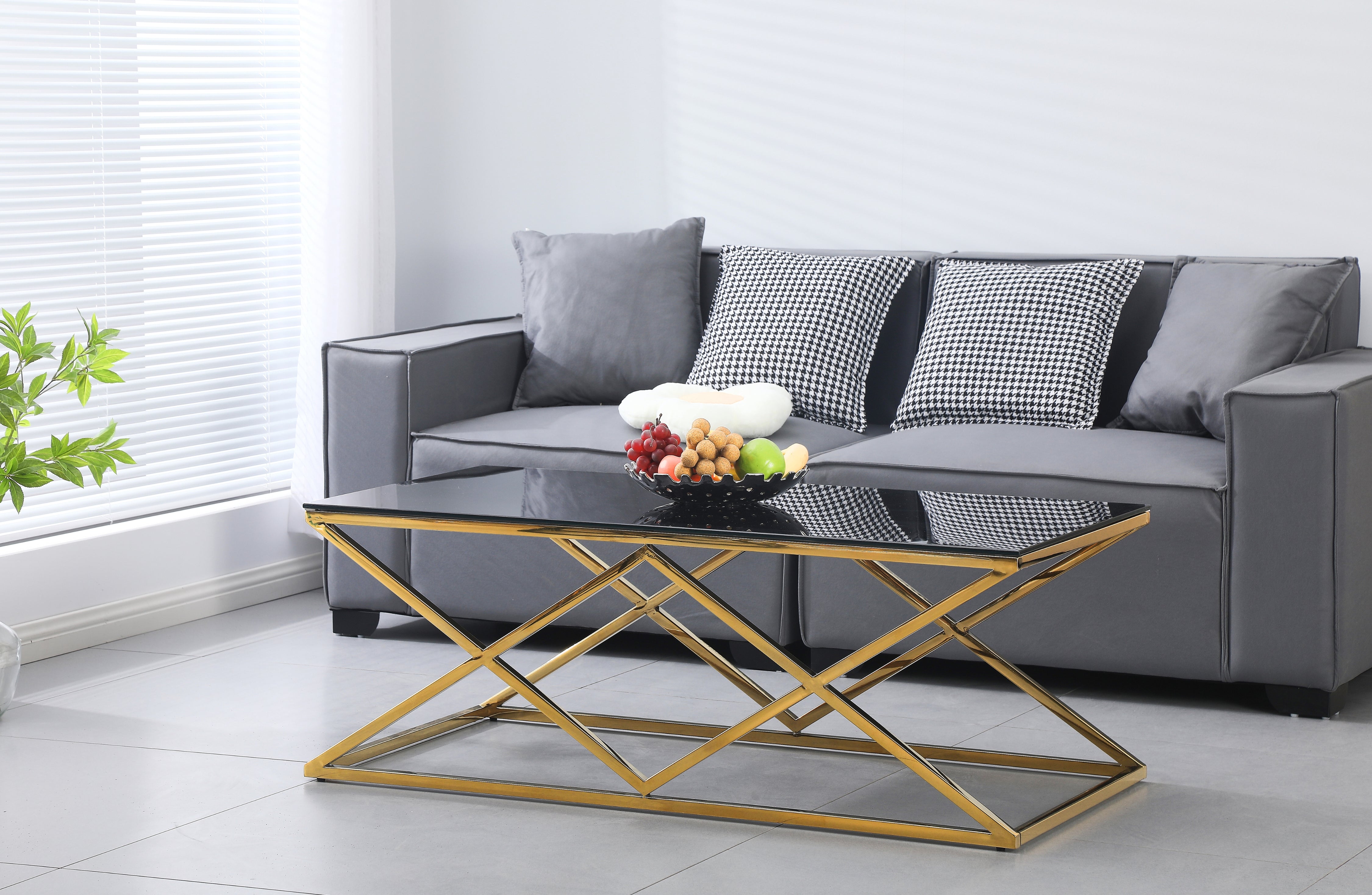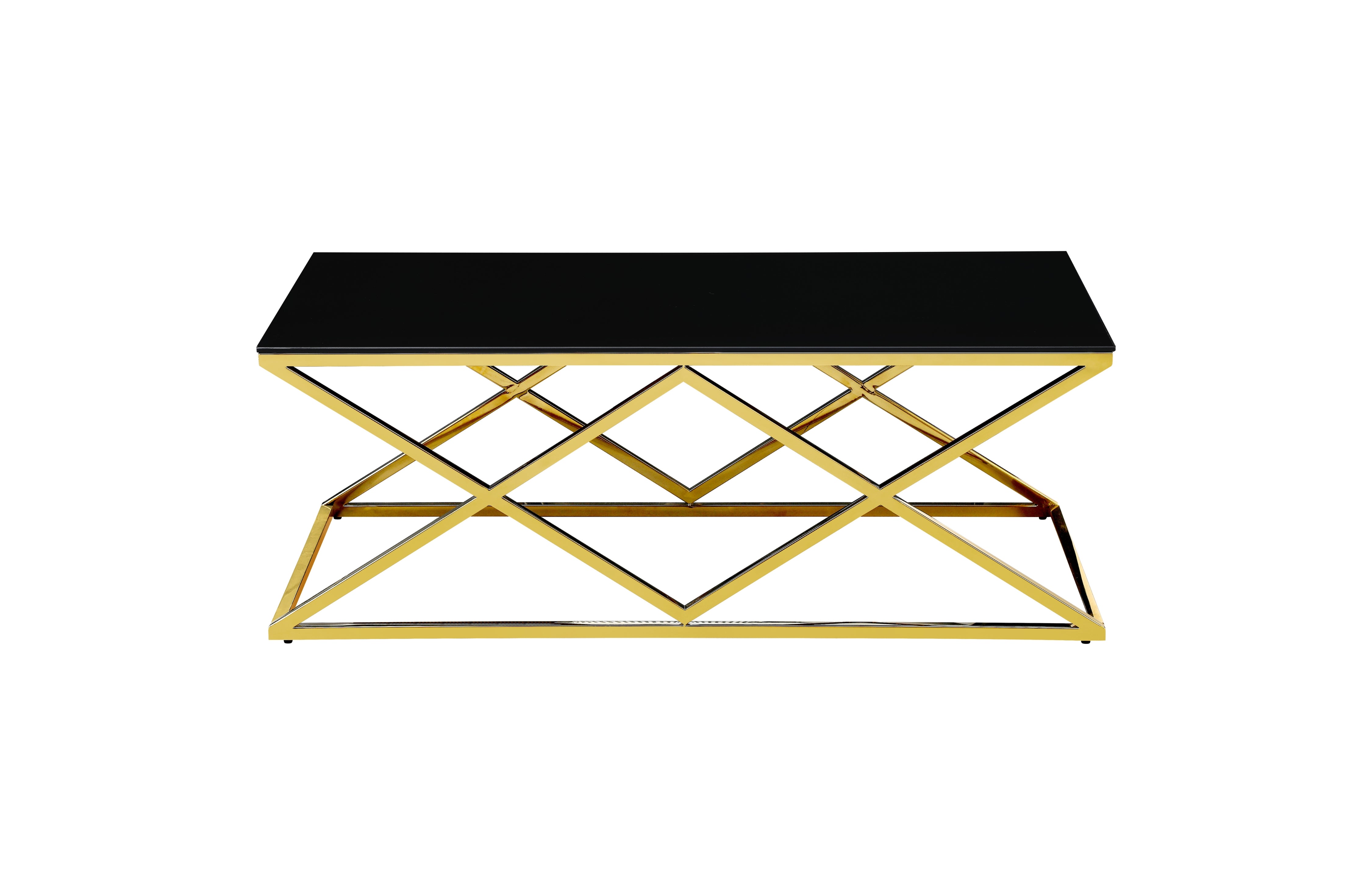 • Beverly coffee table in gold frame with bold black tempered glass top.