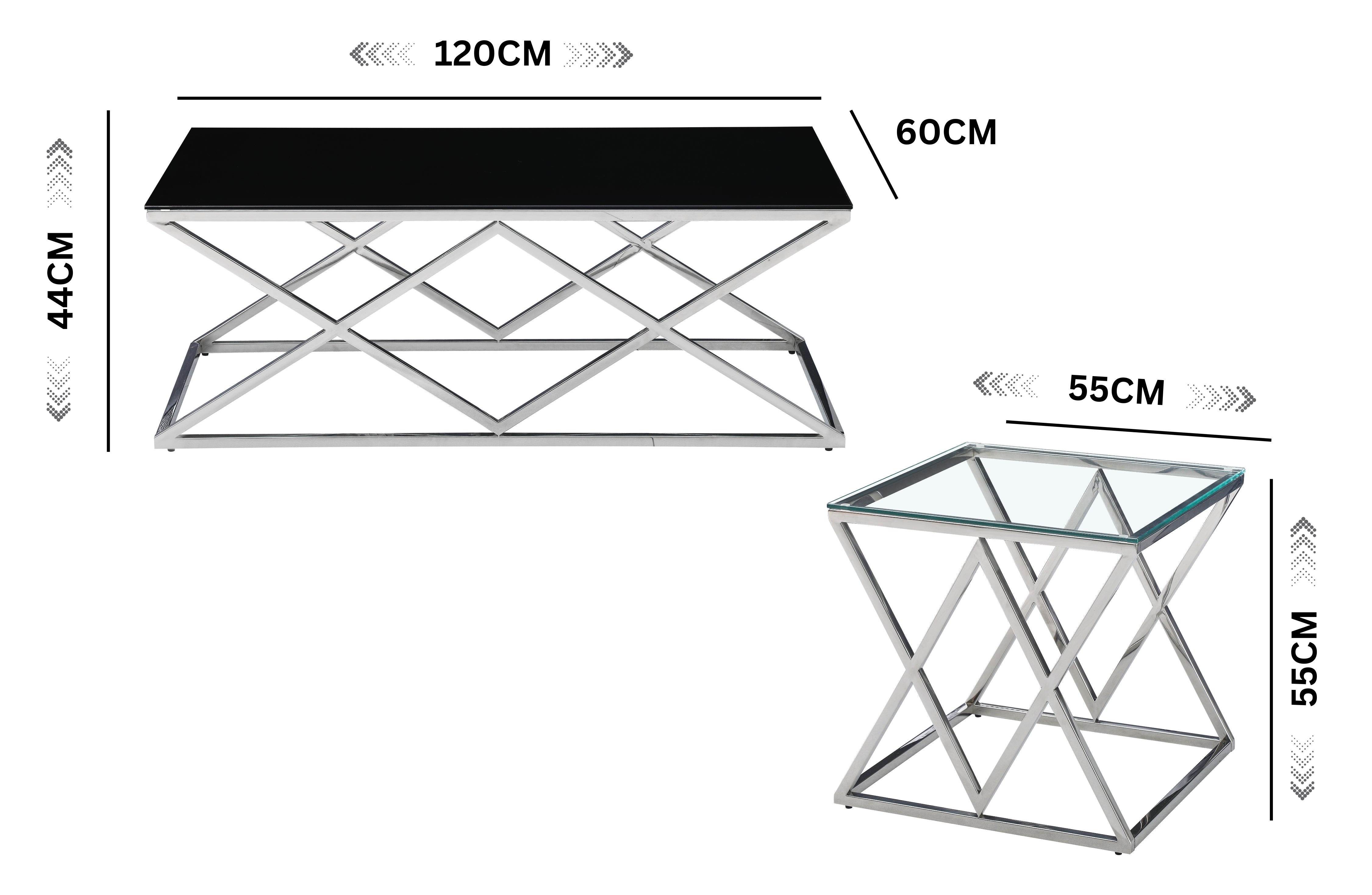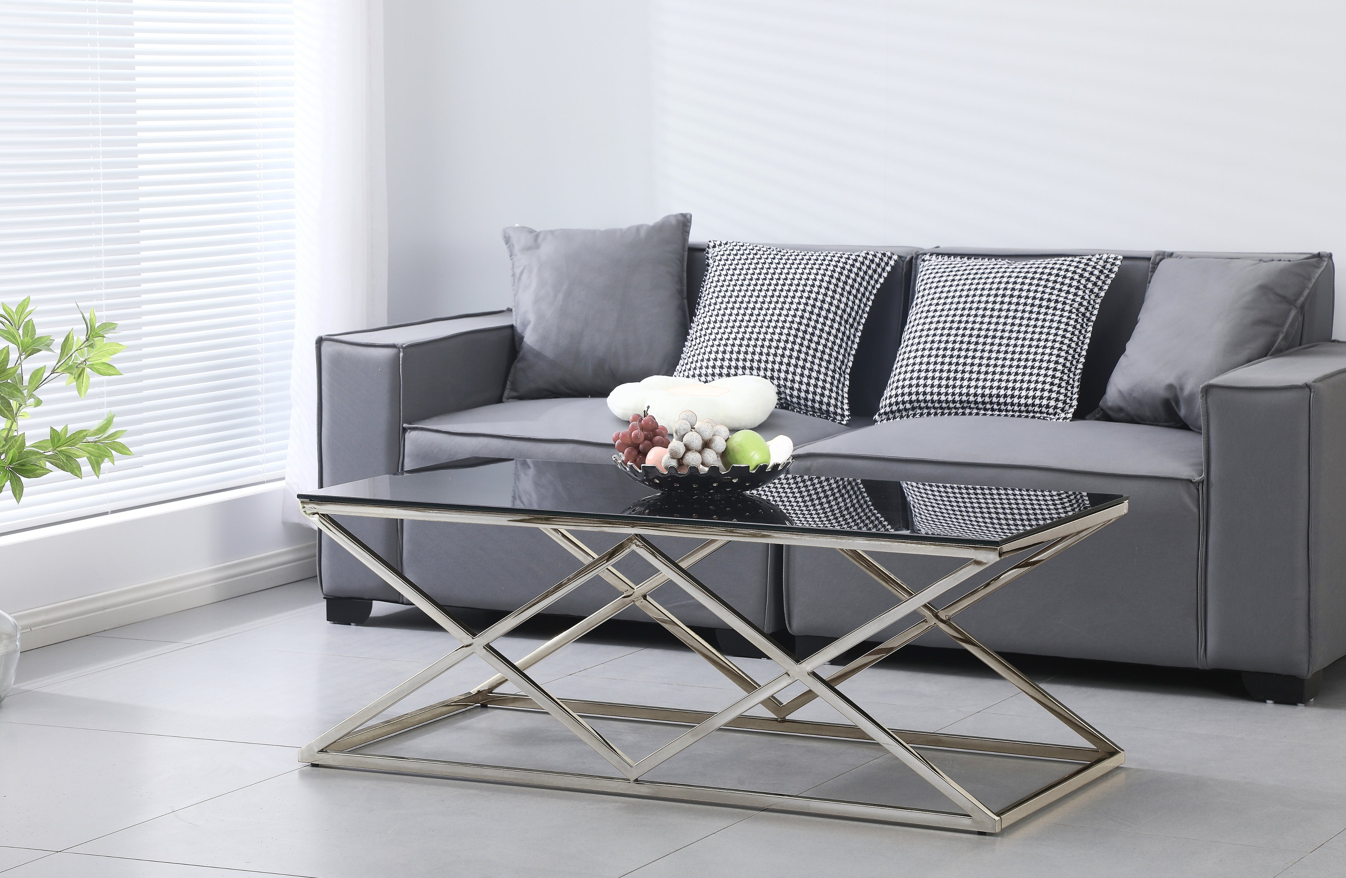 • Beverly coffee table in silver polished frame with black tempered glass top.