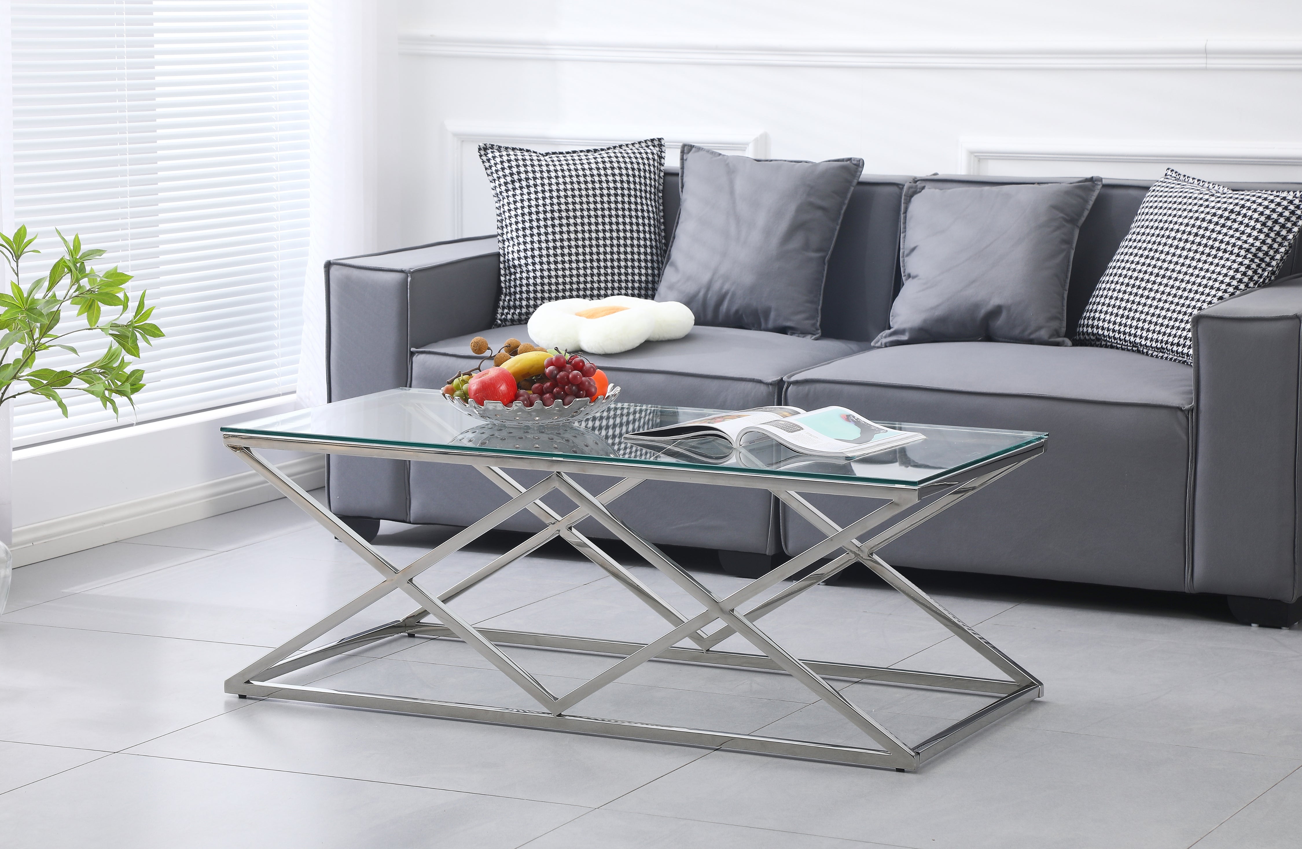 Beverly coffee table in silver polished frame with clear glass top, contemporary sophistication.