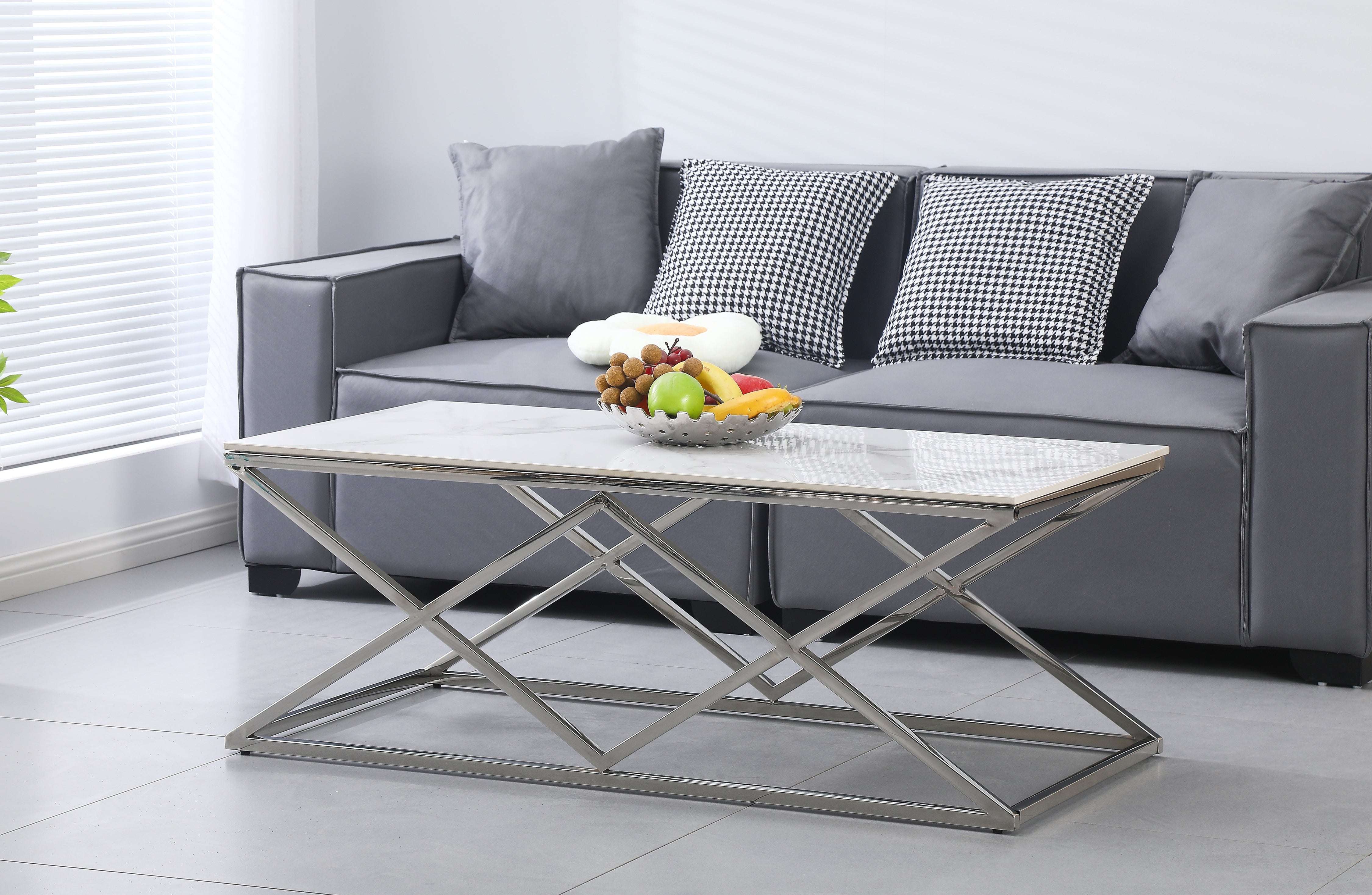 Beverly coffee table in silver polished frame with elegant white marble sintered stone top.