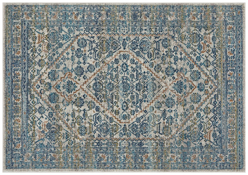 • Evoke 263 Silver Rug with intricate distressed blue, gold, and silver pattern