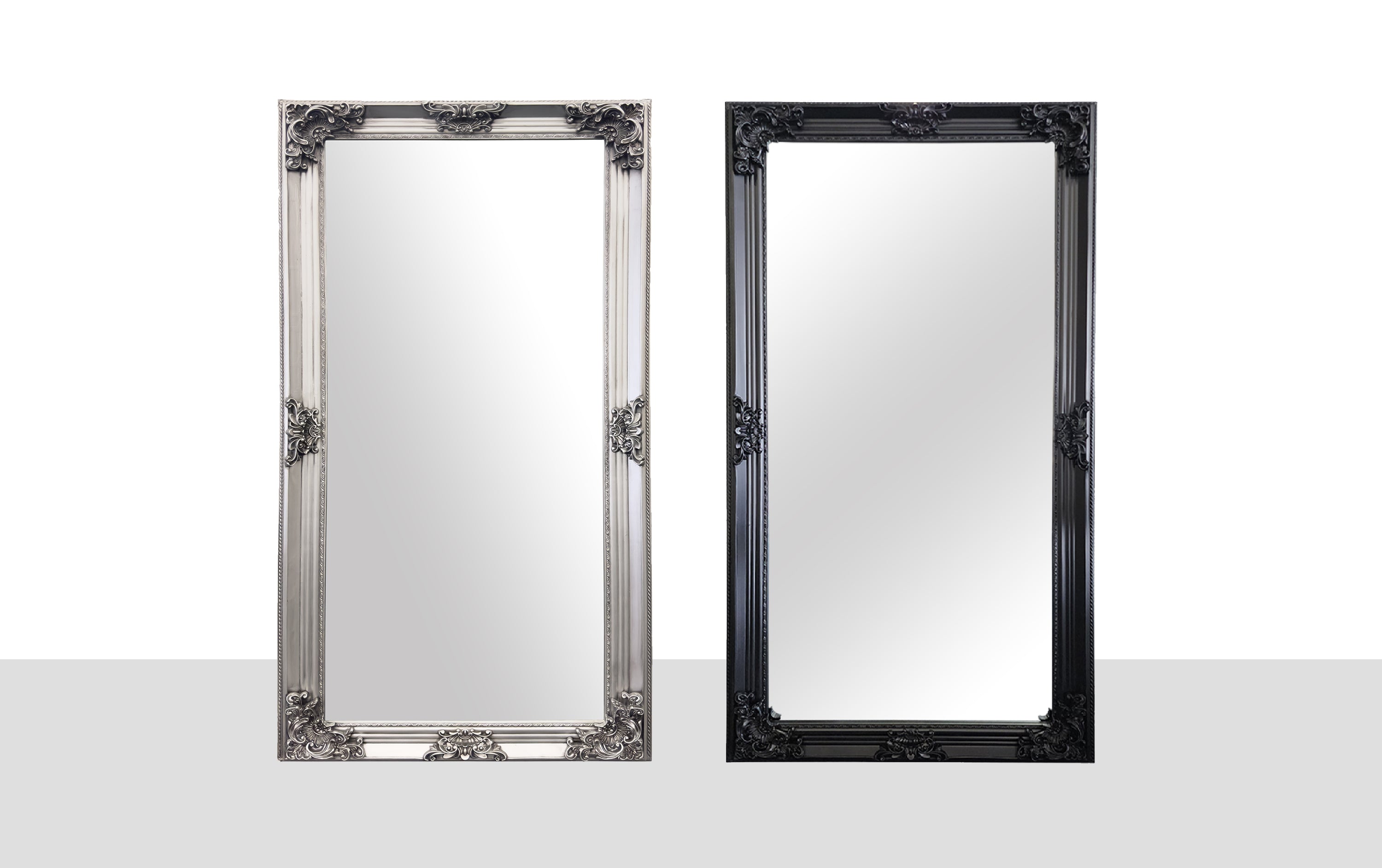 Black French provincial deluxe mirror styled vertically with two armchairs and coffee table décor.